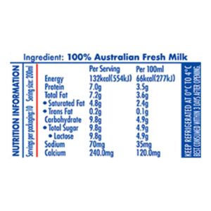 KEY INFORMATION – • 100% fresh – • 100% Australian – • Free range cows – • Contains calcium and protein COUNTRY/PLACE OF ORIGIN COUNTRY/PLACE OF ORIGIN Singapore PREPARATION PREPARATION Ready to drink STORAGE INFORMATION STORAGE INFORMATION Best consumed within 3 days of opening