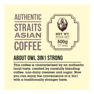 KEY INFORMATION KEY INFORMATION OWL Regular Low Fat Instant 3in1 Coffee is a convenient cup of instant coffee with an authentic local taste inspired by the Straits Asian coffee heritage, created by carefully blending coffee, non dairy creamer and sugar. Enjoy the convenience of this 3in1 with a traditionally stronger taste. Made with a blend…
