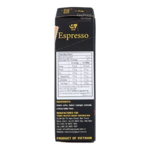 KEY INFORMATION KEY INFORMATION Crafted from pure Arabica beans, G7 Espresso will appeal to fans looking for a unique mix of profound and bold tastes, yet gentle aromas. Definitely a must for coffee lovers. COUNTRY/PLACE OF ORIGIN COUNTRY/PLACE OF ORIGIN Vietnam STORAGE INFORMATION STORAGE INFORMATION Store in a cool, dry place.