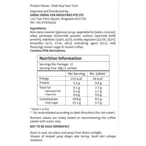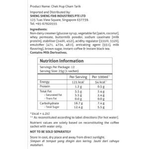 KEY INFORMATION – A unique taste of hand-pulled frothy coffee with condensed milk taste which reminiscing familiar memories ones could merely get from local kopitiam. – Chek Hup Kopi Tarik uses the perfect blend of imported Brazilian coffee beans, roasted medium to dark for the smoky coffee aroma, then combined with a milky taste creamer…