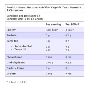 KEY INFORMATION KEY INFORMATION Nature’s Nutrition organic turmeric & cinnamon tea is a specially blended revitalising tea. Turmeric and cinnamon are known for their antioxidant effects, supporting joint, heart and brain health. Prepared with licorice root and black pepper to maximise your body’s absorption of the essential nutrients in turmeric and cinnamon. COUNTRY/PLACE OF ORIGIN…