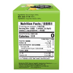 KEY INFORMATION – • No Added Sugar – – • All Natural – – • Caffeine Free COUNTRY/PLACE OF ORIGIN COUNTRY/PLACE OF ORIGIN Singapore PREPARATION – 1. Place 1 ginger bag into a cup, add 250ml of hot water – 2. Infuse for 2 to 3 minutes according to desired strength STORAGE INFORMATION STORAGE INFORMATION…