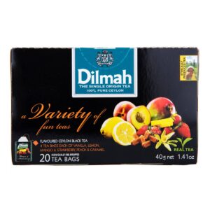 KEY INFORMATION KEY INFORMATION Dilmah Variety Tea Bags is flavoured ceylon black tea bags each of vanilla, lemon, mango & strawberry, peach and caramel. COUNTRY/PLACE OF ORIGIN COUNTRY/PLACE OF ORIGIN Sri Lanka STORAGE INFORMATION STORAGE INFORMATION Store in a cool, dry place