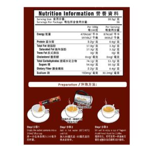 KEY INFORMATION – • Creamy – • Aromatic – • Rich layer of foam COUNTRY/PLACE OF ORIGIN COUNTRY/PLACE OF ORIGIN Malaysia PREPARATION PREPARATION Pour one sachet in a cup and add 180ml of hot water STORAGE INFORMATION STORAGE INFORMATION Store in a dry place