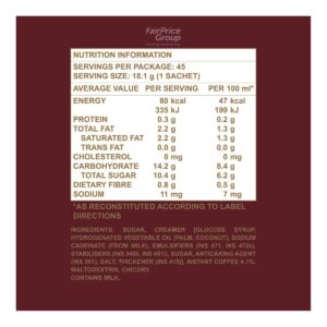 KEY INFORMATION KEY INFORMATION This blend of blend of coffee, non-dairy creamer and sugar provides a smooth & creamy mouthfeel with every cup. COUNTRY/PLACE OF ORIGIN COUNTRY/PLACE OF ORIGIN Malaysia STORAGE INFORMATION STORAGE INFORMATION Store in a cool and dry place