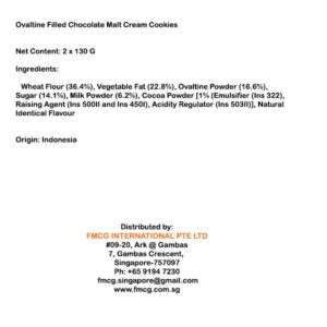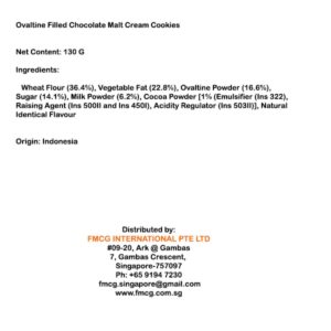 KEY INFORMATION KEY INFORMATION An original Ovaltine cookie with your all-time favorite chocolate and malt cream. Each cookie has just the right sweet taste. Yum!! The cookie is soft and chewy in every bite .. COUNTRY/PLACE OF ORIGIN COUNTRY/PLACE OF ORIGIN Indonesia STORAGE INFORMATION STORAGE INFORMATION Room Temperature