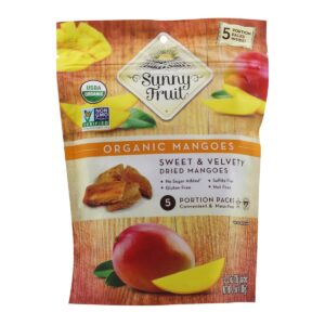 KEY INFORMATION – – Sunny Fruit organic dried fruits don’t contain any gluten, dairy, eggs, sulphite, or soy. – – They are also manufactured in a facility free of sesame, peanut or tree nuts. – – Sweet and velvety, all natural organic dried mangoes are an ideal snack for those who would like to maintain…