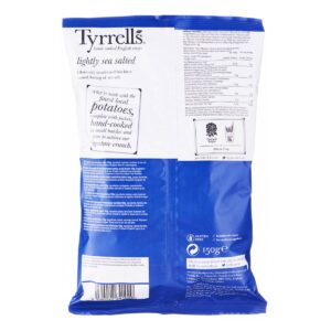 KEY INFORMATION KEY INFORMATION Tyrrells Lightly Sea Salt Potato Chips gloriously unadorned but with a casual dusting of sea salt which made with finest Herefordshire potatoes, complete with jackets. Hand cooked to achieve our signature crunch. COUNTRY/PLACE OF ORIGIN COUNTRY/PLACE OF ORIGIN United Kingdom