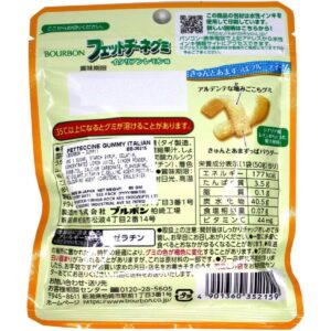 KEY INFORMATION KEY INFORMATION Fun and chewy gummy in the Italian Fettuccine Shaped. COUNTRY/PLACE OF ORIGIN COUNTRY/PLACE OF ORIGIN Japan STORAGE INFORMATION STORAGE INFORMATION Store in a cool and dry place. Keep away from direct sunlight.