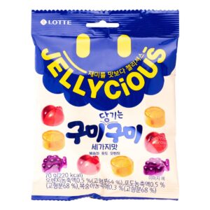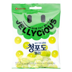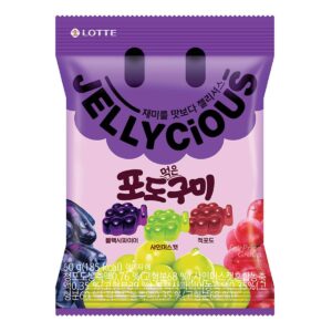 KEY INFORMATION KEY INFORMATION Lotte Jellycious Grape flavor is soft and delicious bite-sized grape-flavored jelly gums. Jelly and delicious gives you JELLYCIOUS! This pack consists of three addictive fruit flavors in one pack – red grape, black safir, and shine muscat flavor. COUNTRY/PLACE OF ORIGIN COUNTRY/PLACE OF ORIGIN South Korea
