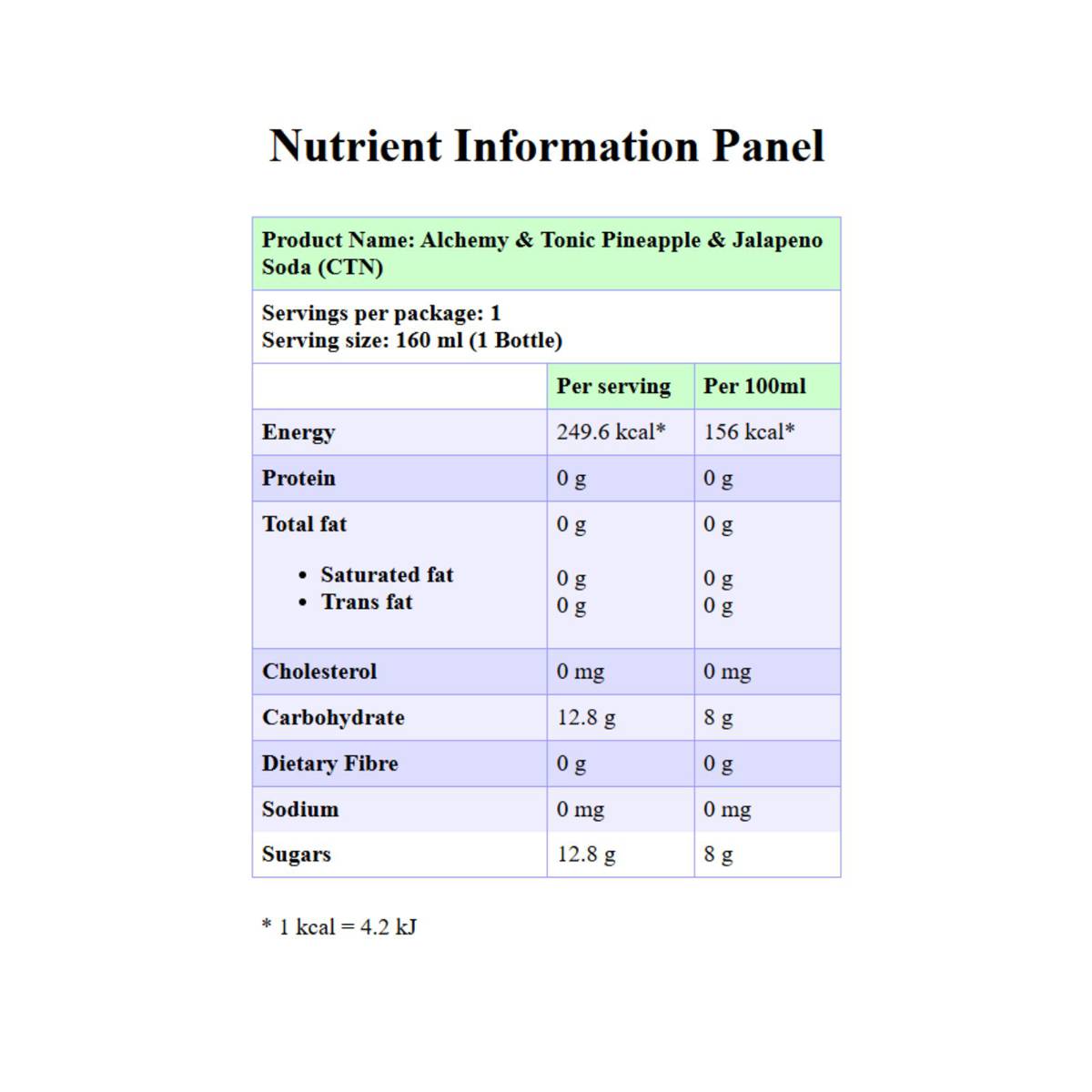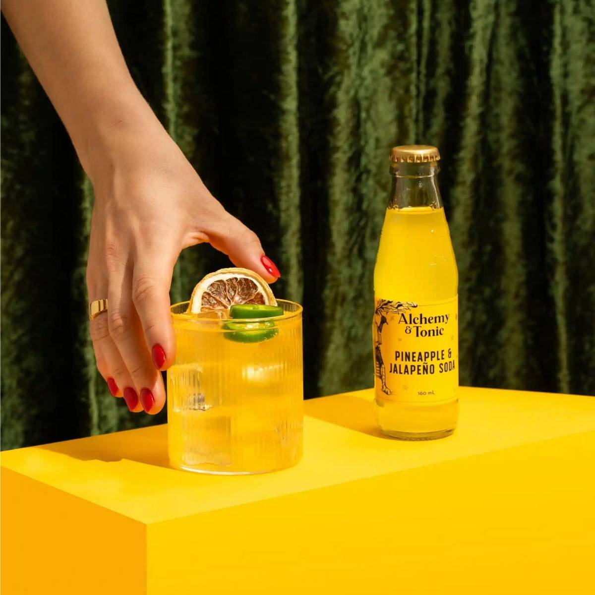 | KEY INFORMATION | Elevate your drink of choice with Alchemy & Tonic – Pineapple and Jalapeno Infused Soda. Crafted with the essence of tropical pineapple and spicy jalapeno extracts, each sip is a tantalizing blend of sweet and heat. Perfect for pairing with Tequila or enjoying on its own. Let your taste buds be ignited! |