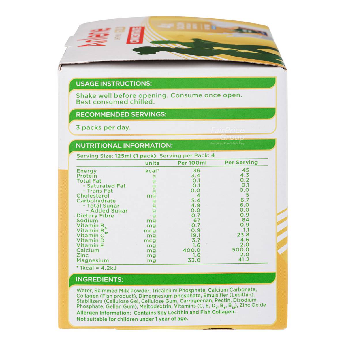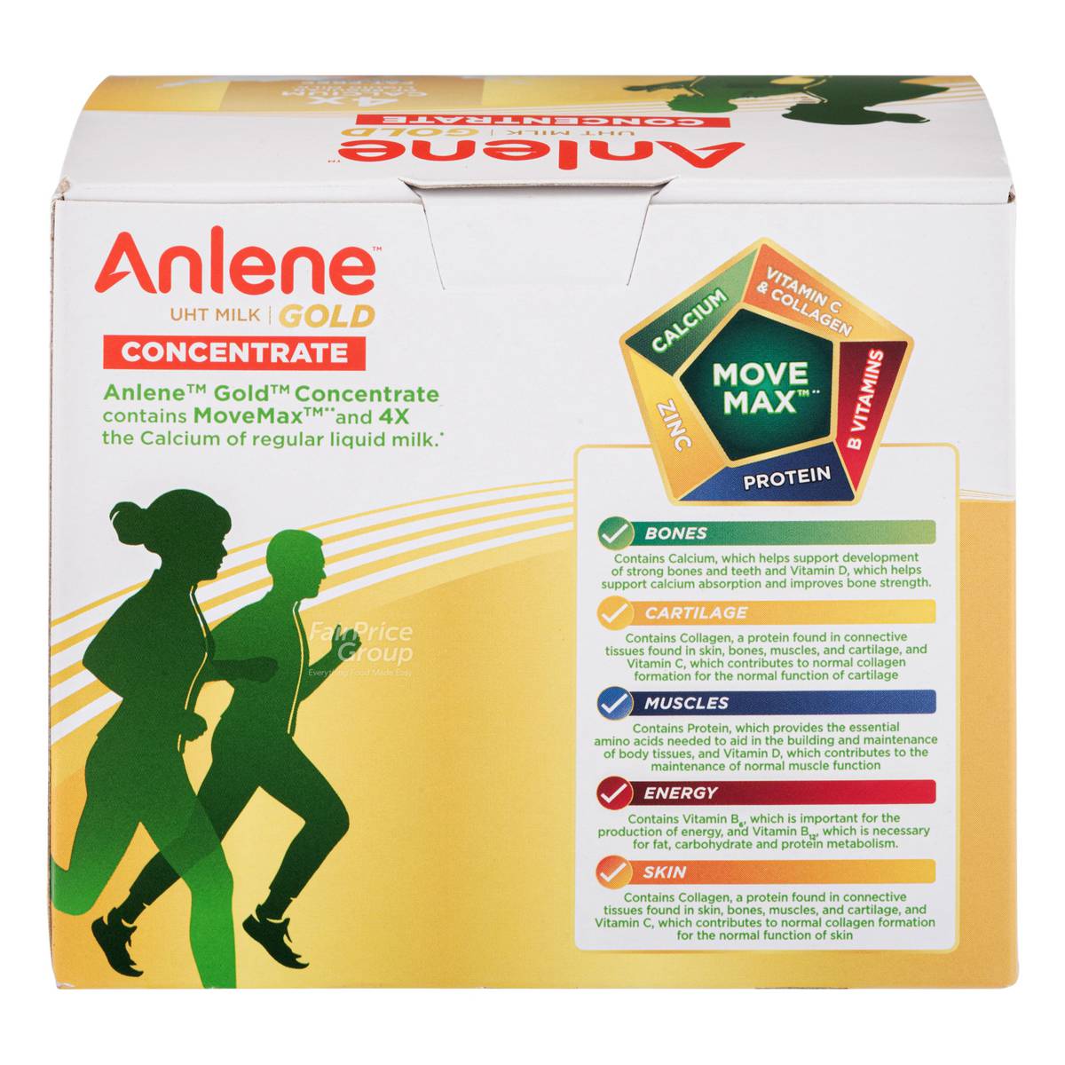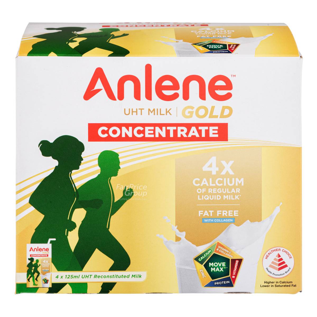 | KEY INFORMATION | Anlene MoveMax Concentrate – Fat Free with Collagen is a healthier choice-endorsed low-fat liquid milk that combines nutritious milk with great taste. Flavoured with a delectable and light milky goodness, it is enriched with essential nutrients such as collagen, protein, calcium and vitamins C and D that help support your bones, cartilage and muscles. Containing 4x the amount of calcium compared to regular fresh milk, 2 packets of Anlene concentrate a day provides you with 100% of your daily calcium needs to ensure that you stay active and energetic with the freedom to move. Suitable forbreakfast or mid-snack for all age groups. |