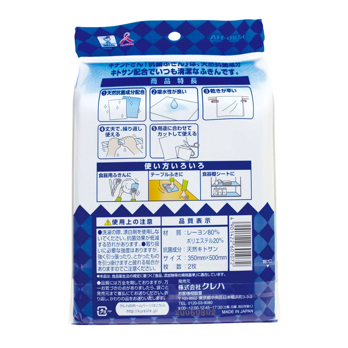 | KEY INFORMATION | This cloth contains the natural antibacterial ingredient chitosan, so it is always clean. It is highly absorbent, easy to wipe off, and made of non-woven rayon, so it dries quickly and is hygienic. Size 350mm × 500mm. Material: 80% rayon, 20% polyester. Antibacterial ingredient: natural chitosan. |