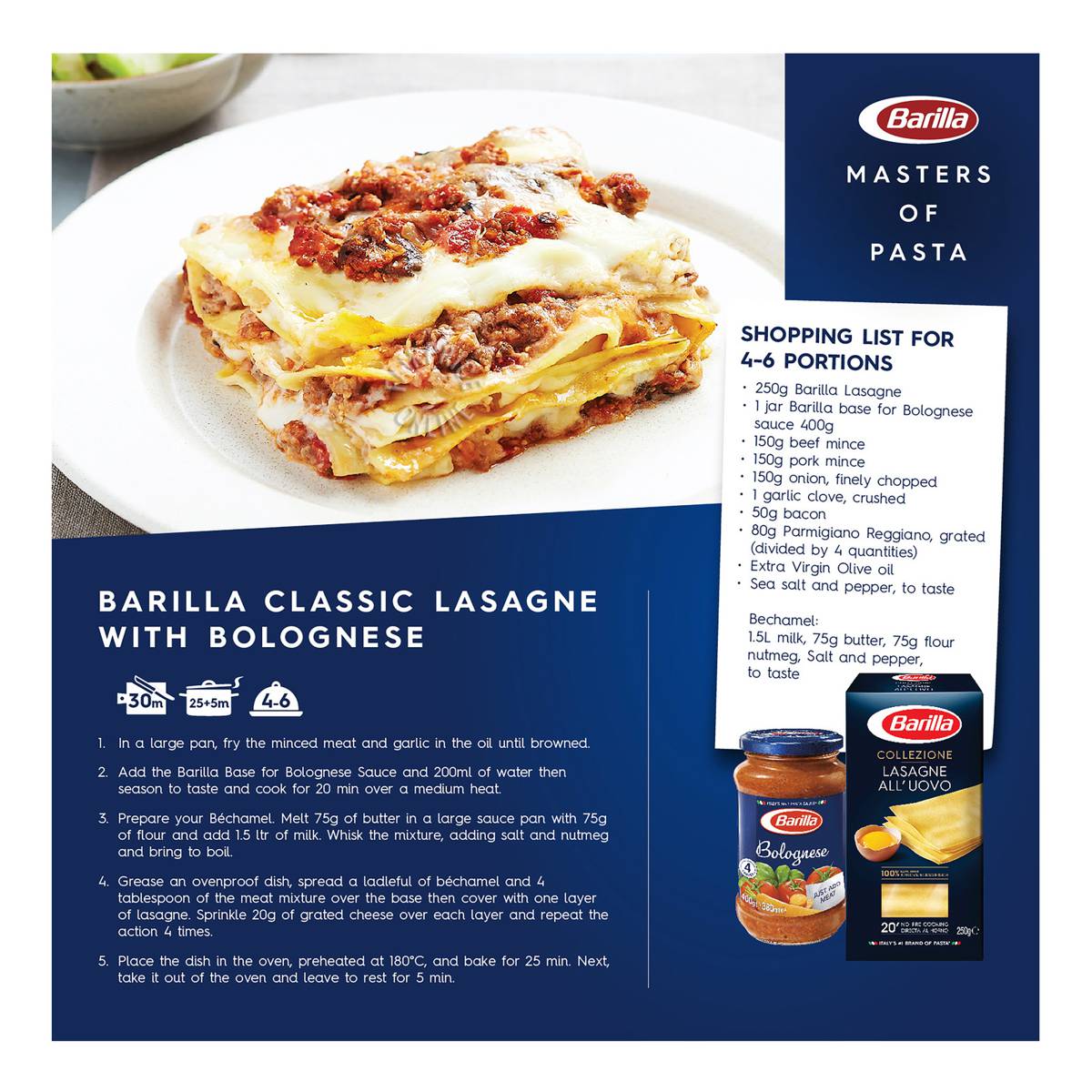 | – | Barilla Lasagne is the most well-known of all baked pasta dishes. Barilla lasagne do not need to be pre-cooked. Try with meat-based sauces like traditional Bolognese, dairy-based sauces like a classic béchamel, or vegetable-based sauces and enjoy an authentic Italian meal. This style of pasta features: |