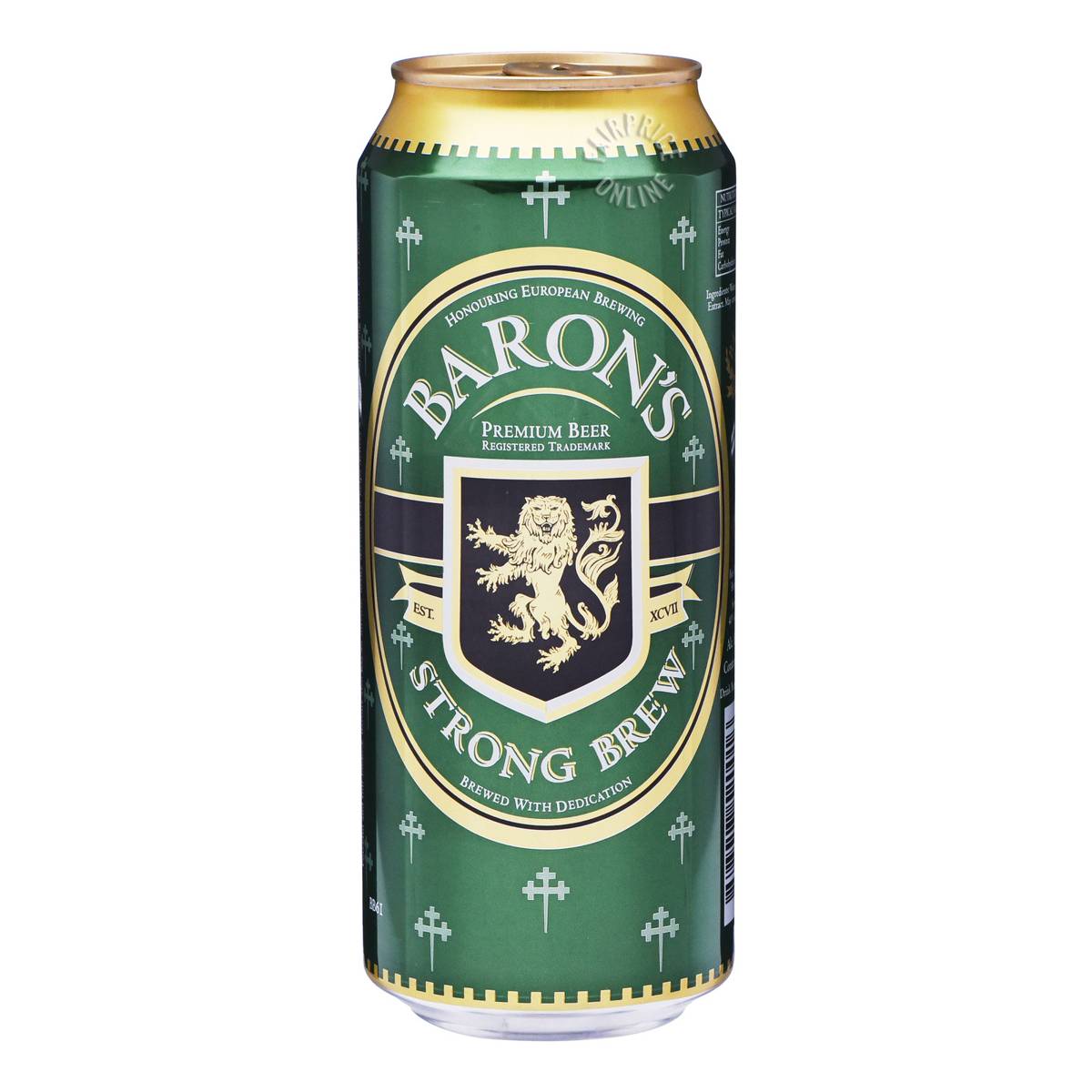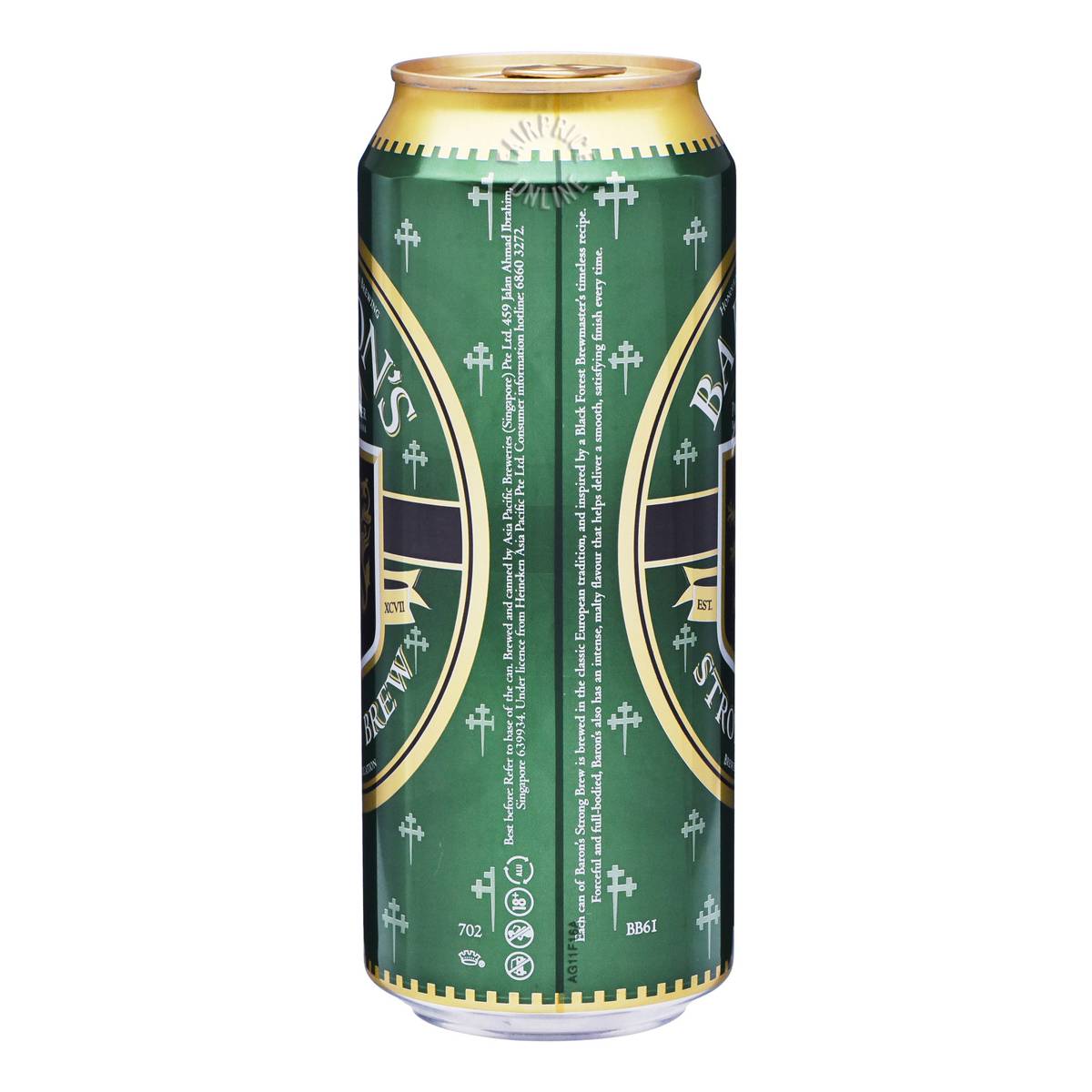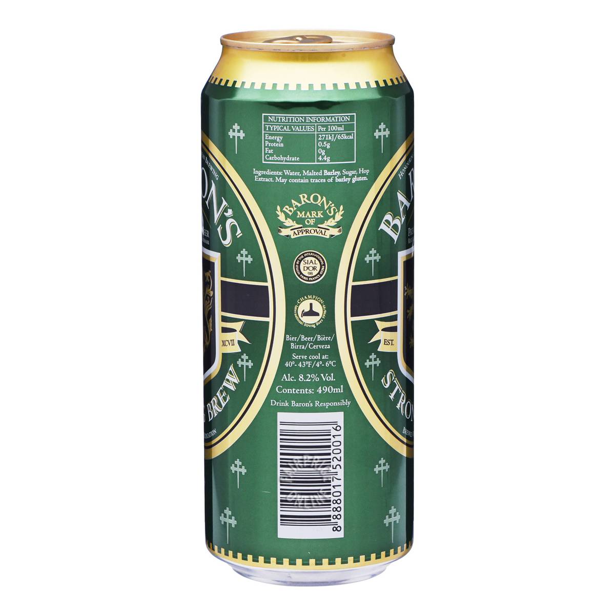 | KEY INFORMATION | Each can of Baron’s Strong Brew is brewed in the classic European tradition, and inspired by a Black Forest Brewmaster’s timeless recipe. Forceful and full-bodied, Baron’s also has an intense, malty flavour that helps deliver a smooth, satisfying finish every time. This product contains 8.2% Alc/Vol. |