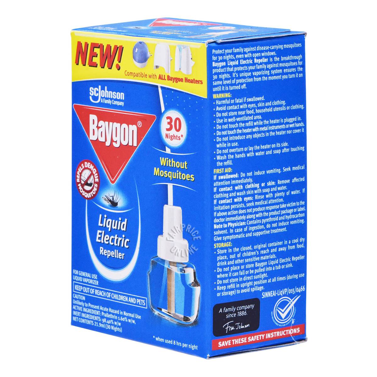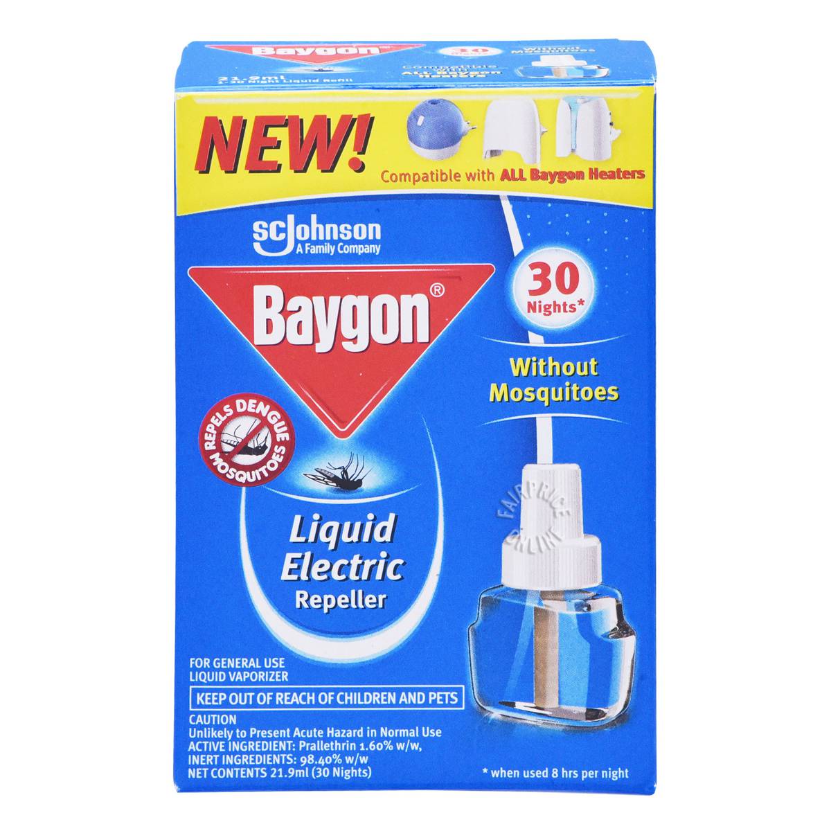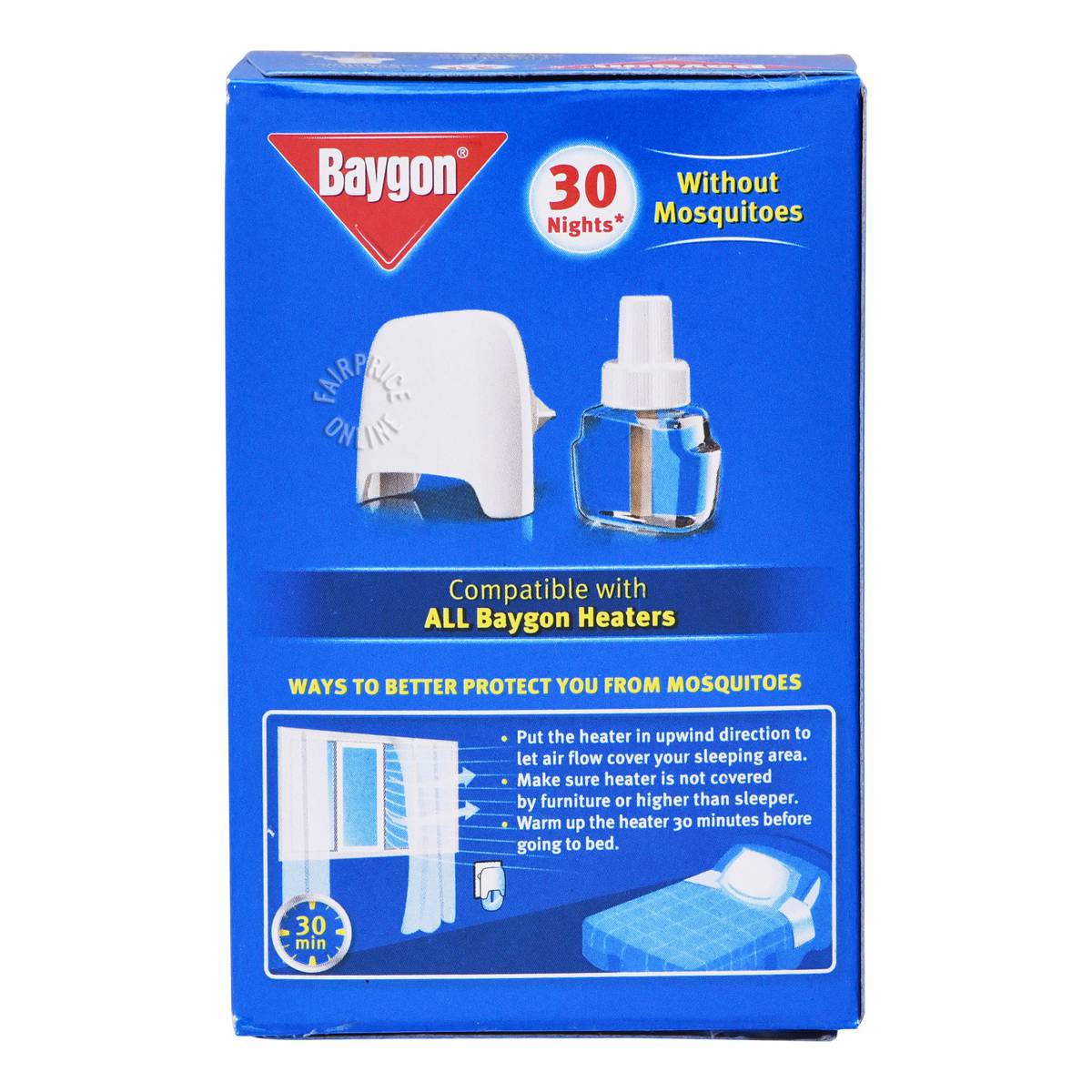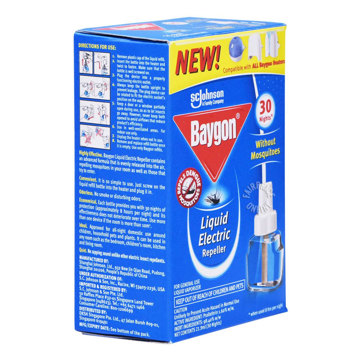 | KEY INFORMATION | It contains an advanced formula that is evenly released into the air, repelling mosquitos in the room as well as those that try to enter. Works as a refill for Baygon Liquid Electric Repeller Starter which is relatively cost-saving for consumer who have started using the repeller. |