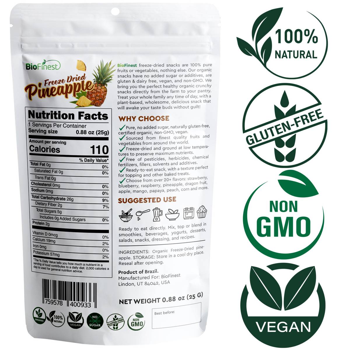 | KEY INFORMATION | ALL NATURAL GMO-FREE: Biofinest superfood snacks are made from 100% real fruits, organic and freeze-dried. Our fruit crisps are gluten-free, GMO-free, low calories, and does not include any preservative or artificial sugar. The vegan dried fruits can be stored and consumed by anyone from a toddler to an adult. Treat your whole family any time of the day, with a plant-based crunchy, healthy and delicious snack without guilt. PACKED WITH NUTRIENTS: This dried pack of fruit is filled with natural nutrients that will benefit your wellness. The freeze-dried fruits are dehydrated and sealed packed to savor the natural aroma, nutritional benefits. These fruit packs can be carried to camps, wilderness, trekking, or any other outdoor adventure and can be used as an easy and natural source of vitamins and minerals. FROM FARM TO SNACK: Our farmers pick the fruits at their peak, then dry them to conserve their rich, juicy flavors, so your whole family can feel good about snacking on this unad |