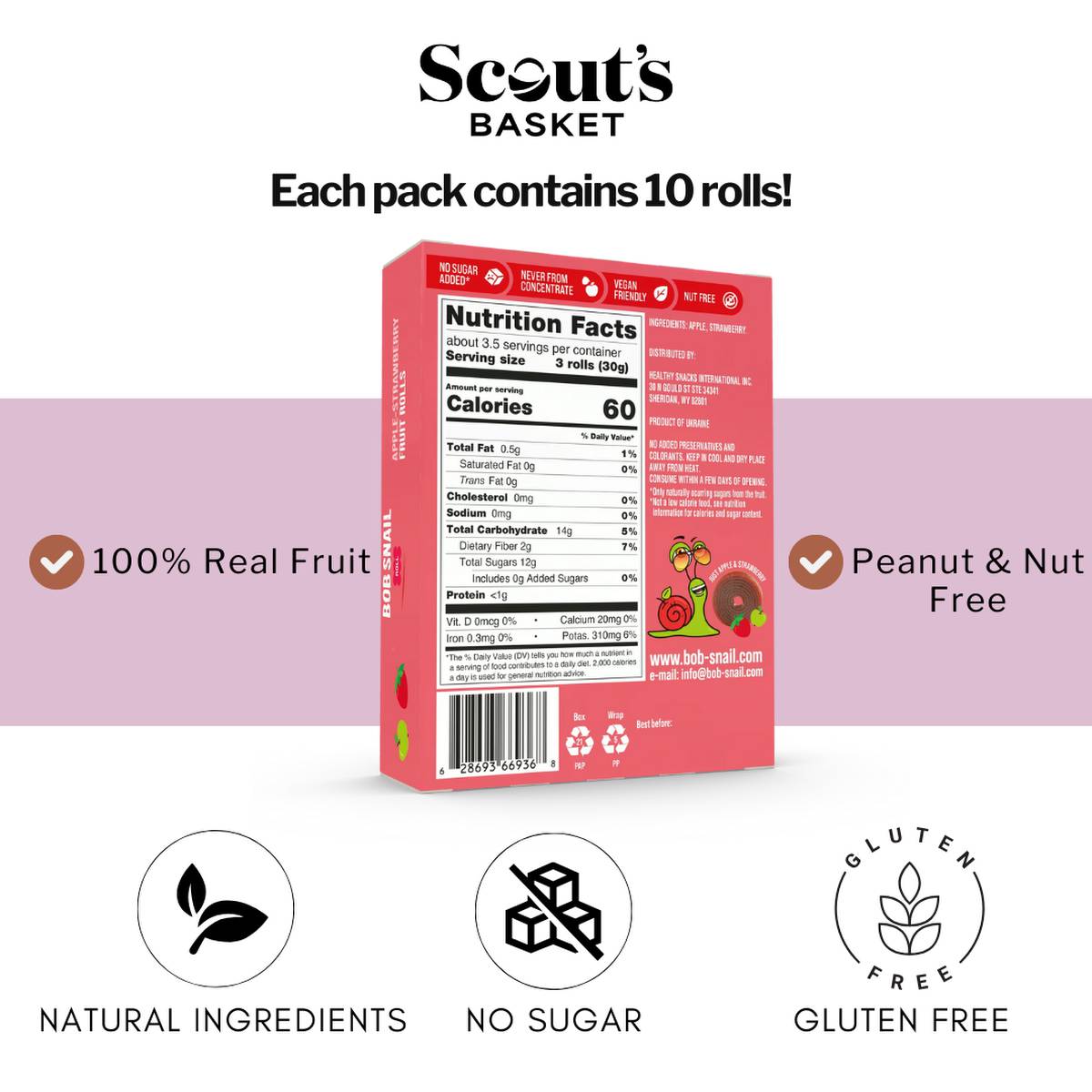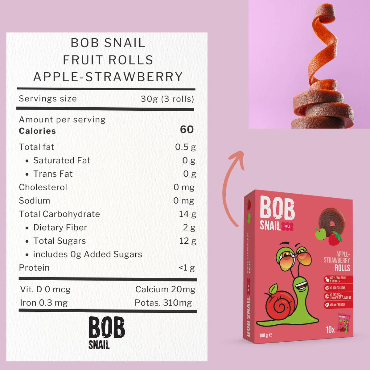 | KEY INFORMATION | A delightful and nutritious snack featuring the freshest apple slices and juicy strawberries. Inspired by the slow and steady pace of Bob the Snail, this wholesome treat is perfect for those who savor the simple pleasures in life. Each pack contains handpicked, sun-ripened fruits, ensuring a burst of natural sweetness with every bite. |