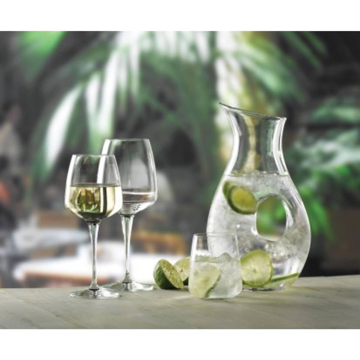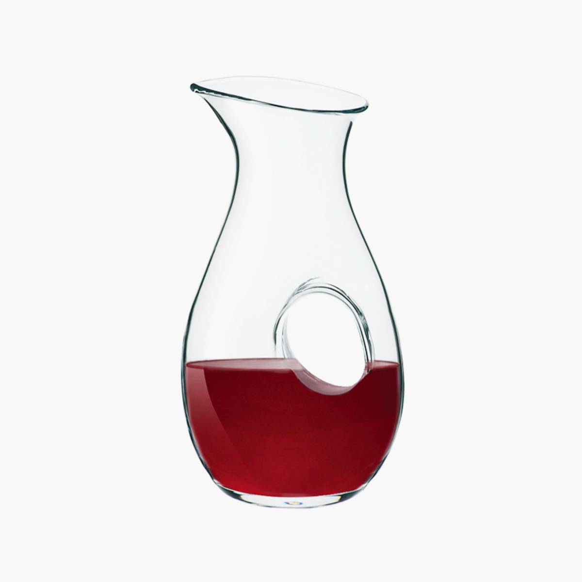 | – | The Aurum jug is an elegant way to serve your favorite wines, sangrias and more. The unique hole design handle is comfortable and keeps the jug balanced while pouring.Hand made in Italy, each piece of Aurum jug is mouth-blown. No mechanical technologies are involved to preserve the uniqueness of each piece. Tiny imperfections, together with little differences between each piece guarantee the uniqueness of the Aurum jug.Hand washing is recommended to maintain the product integrity and brilliance.Capacity of each decanter is 1.5 Ltr and measures 16cm by 11cm by height of 30cm. |