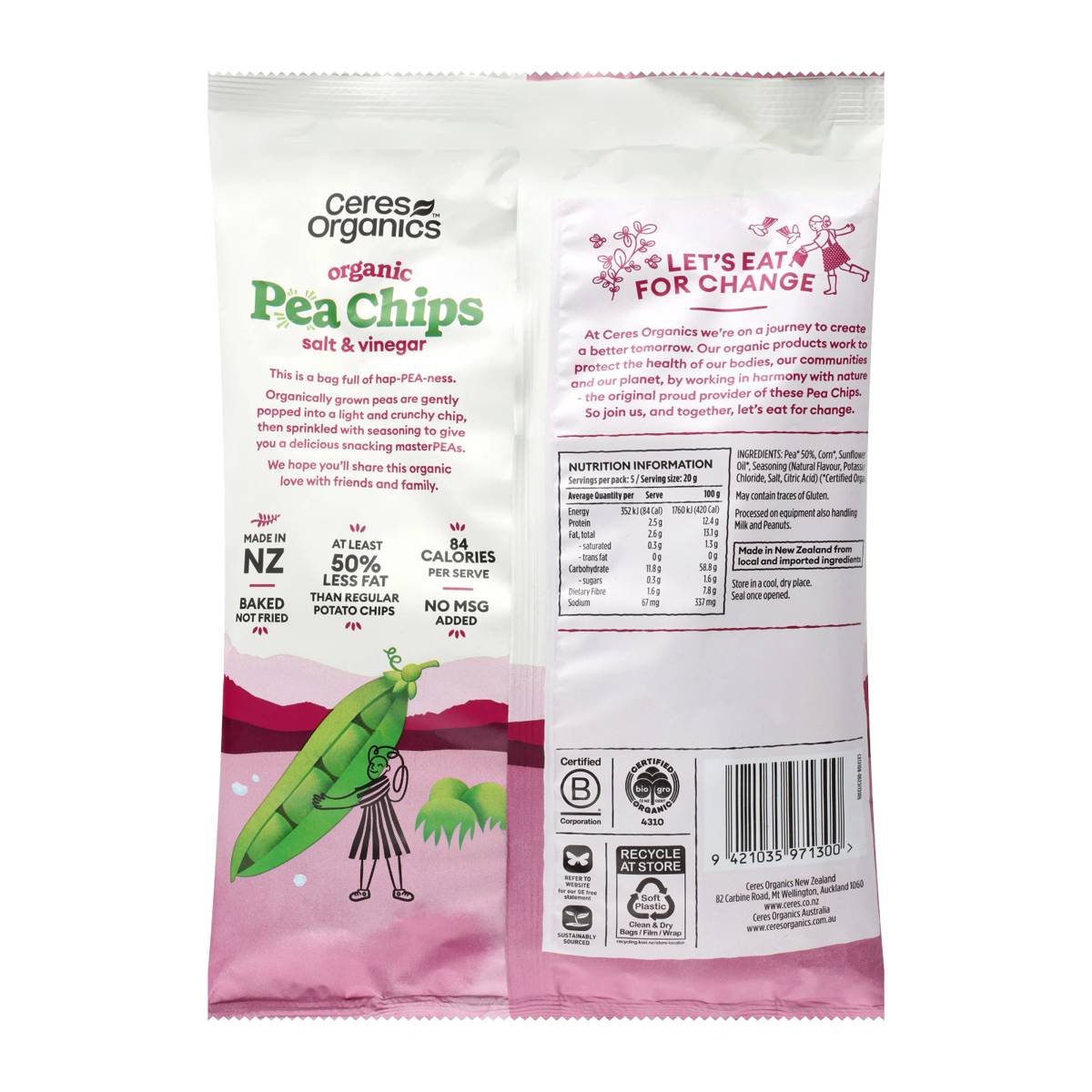 | KEY INFORMATION | Eat your greens, by the handful. Organically grown peas gently popped into a light and crunchy chip, then sprinkled with seasoning to give you a delicious snacking masterPEAs. These bags full of haPEAness have a lot to offer. They have a clean label, with at least 50% less fat than regular potato chips, no MSG added, and of course are proudly certified organic |