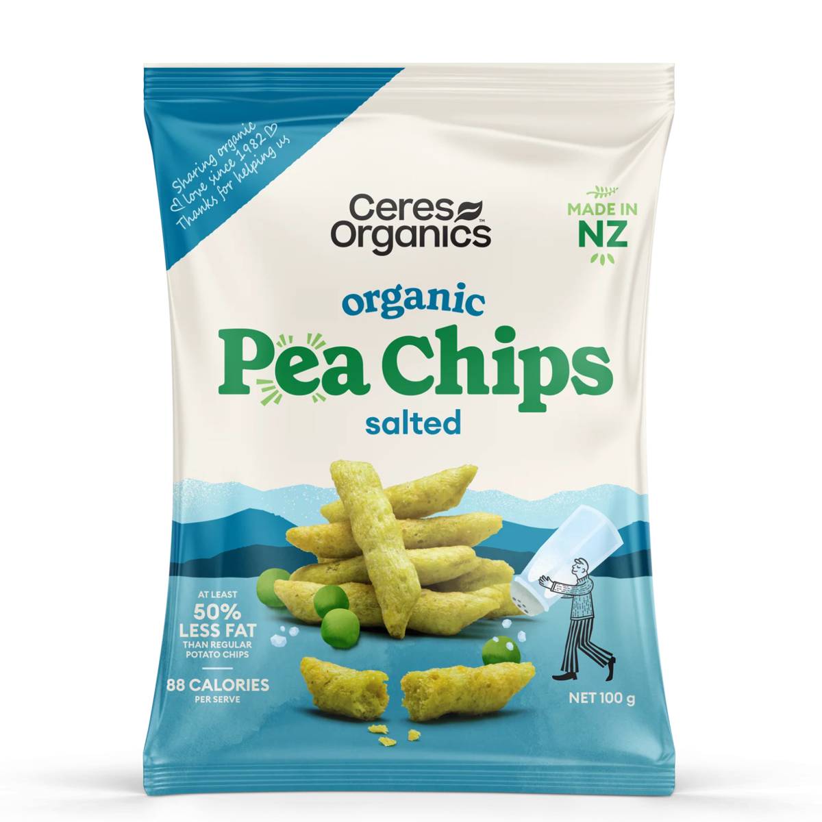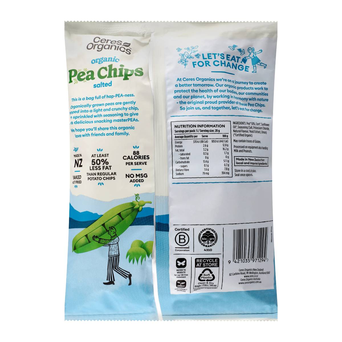 | KEY INFORMATION | Eat your greens, by the handful. Organically grown peas gently popped into a light and crunchy chip, then sprinkled with seasoning to give you a delicious snacking masterPEAs. These bags full of haPEAness have a lot to offer. They have a clean label, with at least 50% less fat than regular potato chips, no MSG added, and of course are proudly certified organic |