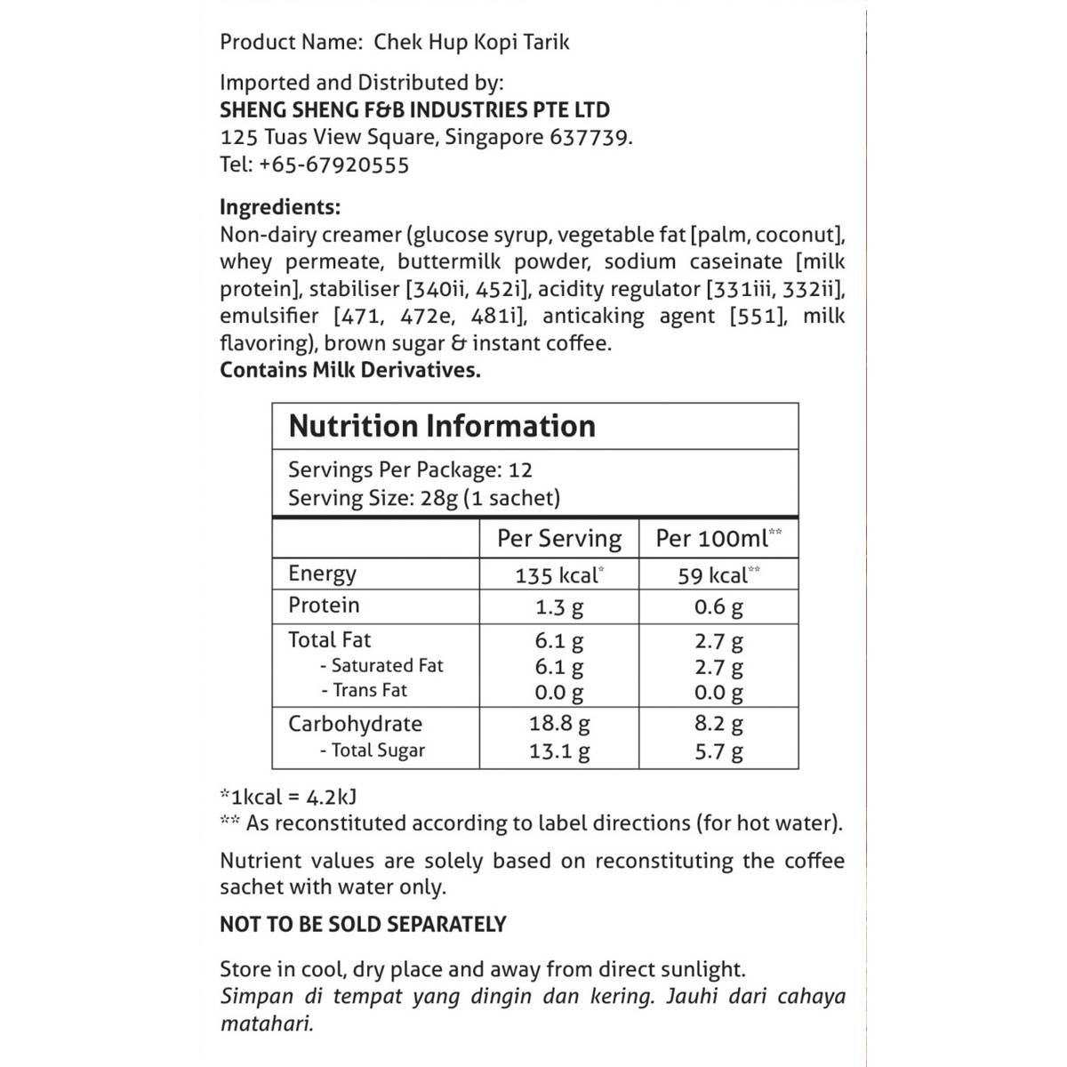 | – | Chek Hup Kopi Tarik uses the perfect blend of imported Brazilian coffee beans, roasted medium to dark for the smoky coffee aroma, then combined with a milky taste creamer for a truly authentic flavour. |
