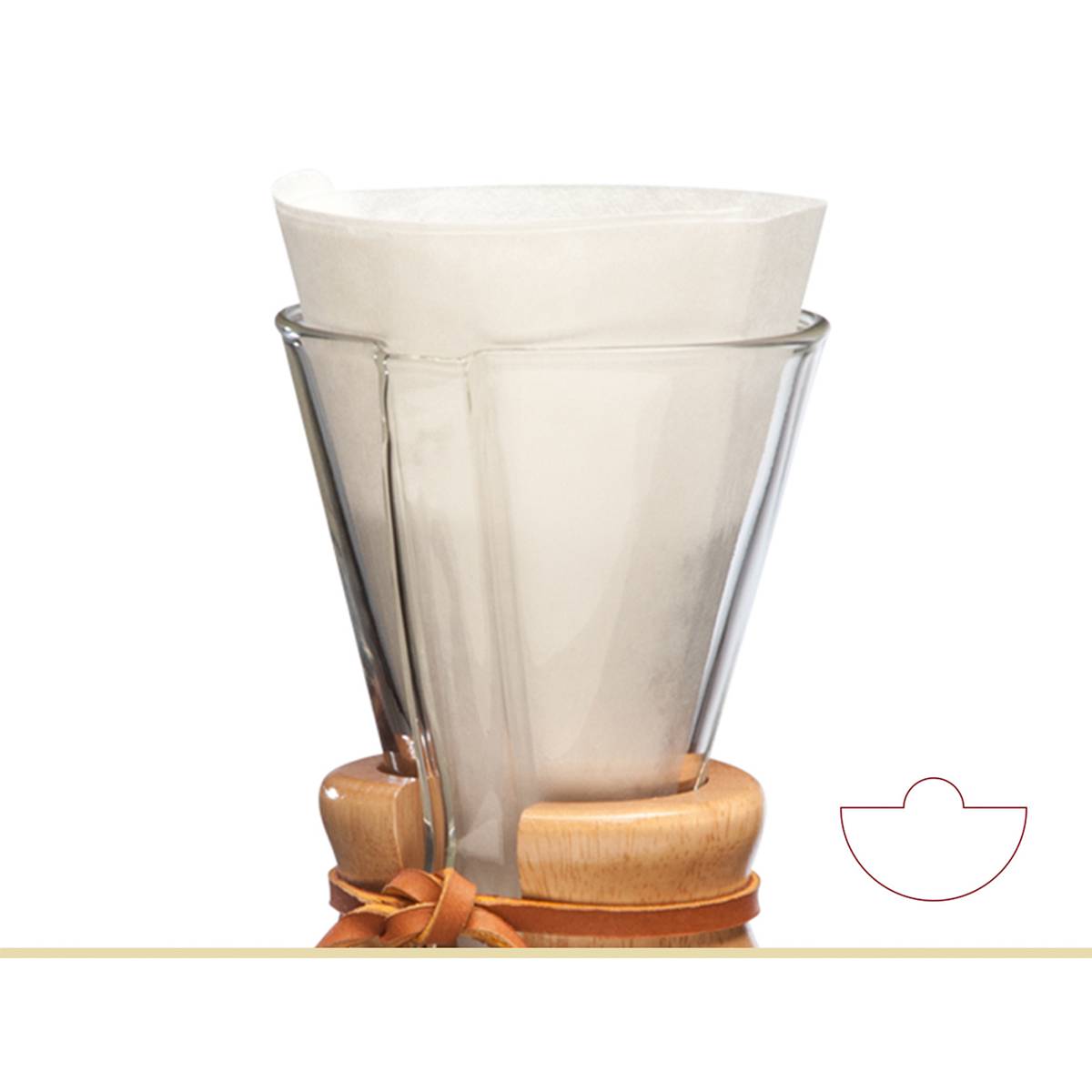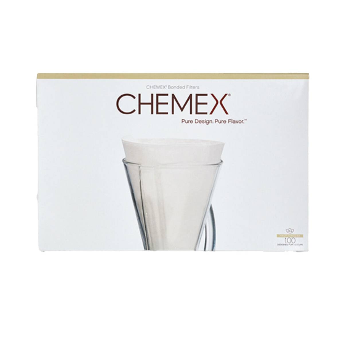 | KEY INFORMATION | CHEMEX Coffeemakers used together with the scientifically designed, patented CHEMEX Bonded Filters, will guarantee that our pourover brewing process will deliver the perfect cup of coffee, without any sediments or bitter elements. What makes CHEMEX Bonded Filters the real deal? – Cone-shape ensures uniform extraction for pure coffee flavor – Thicker (20-30% more than the competition) specialty fiber filter design keep bitter elements, oils, and grounds in their place (and out of your cup) – Prefolded for convenience – Will fit most other cone-shaped filter coffeemakers – Fits CHEMEX Coffeemakers CM-1, CM-1C, CM- |