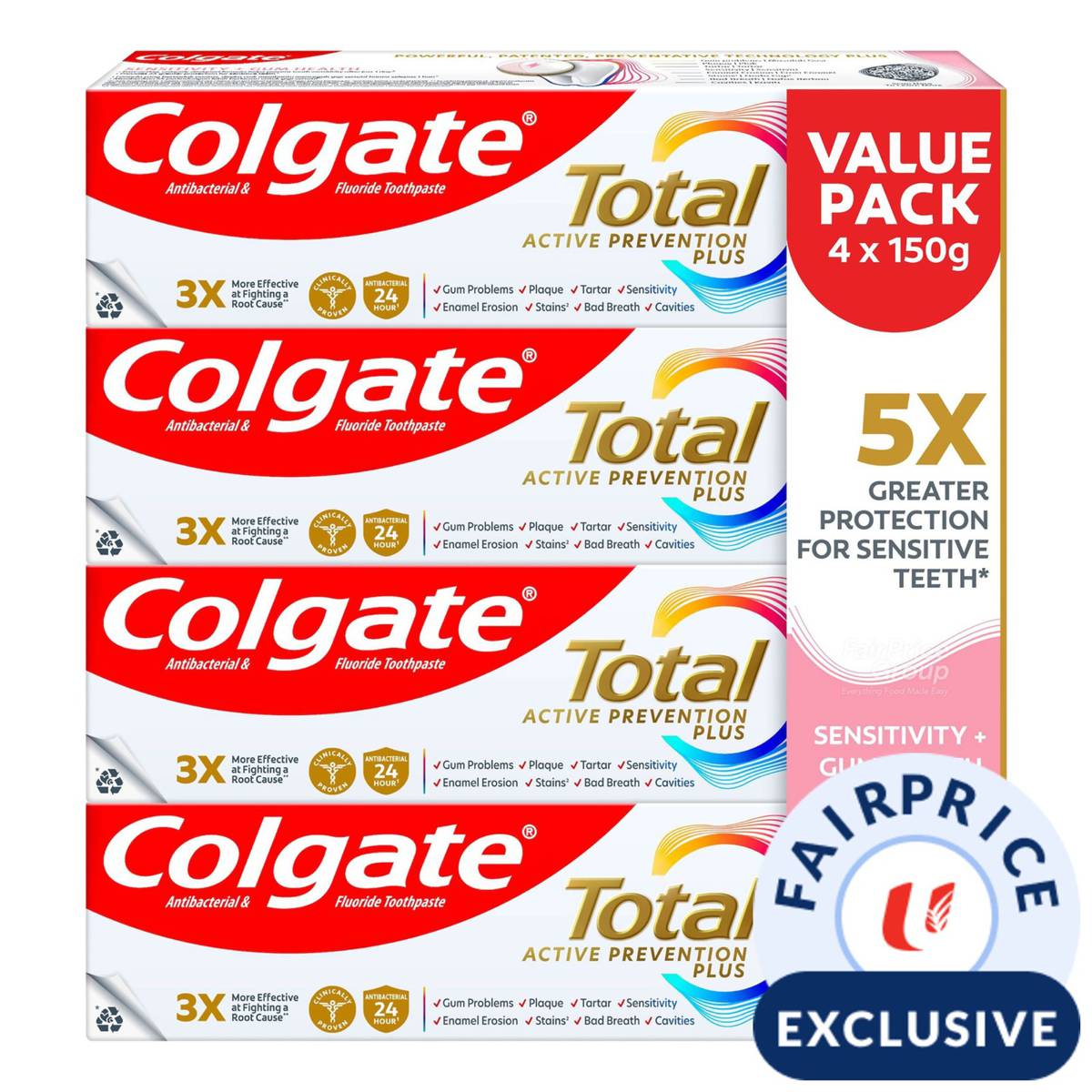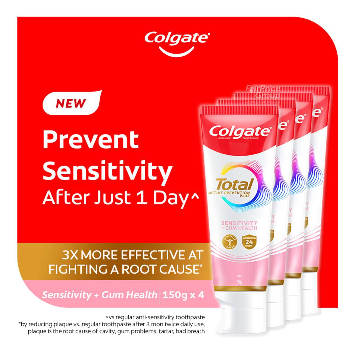 | – | The New Colgate Total Sensitivity & Gum Health toothpaste with Active Prevention Plus, is 3x more effective at fighting a root cause* of top oral issues such as Gum Problems, Plaque, Tartar, Sensitivity, Bad Breath, and Cavities. Its Powerful, Patented, Preventative Technology is clinically proven to provide 24 hours antibacterial action**, that provides long lasting benefits against bacteria to help prevent 8 oral care problems before they start |