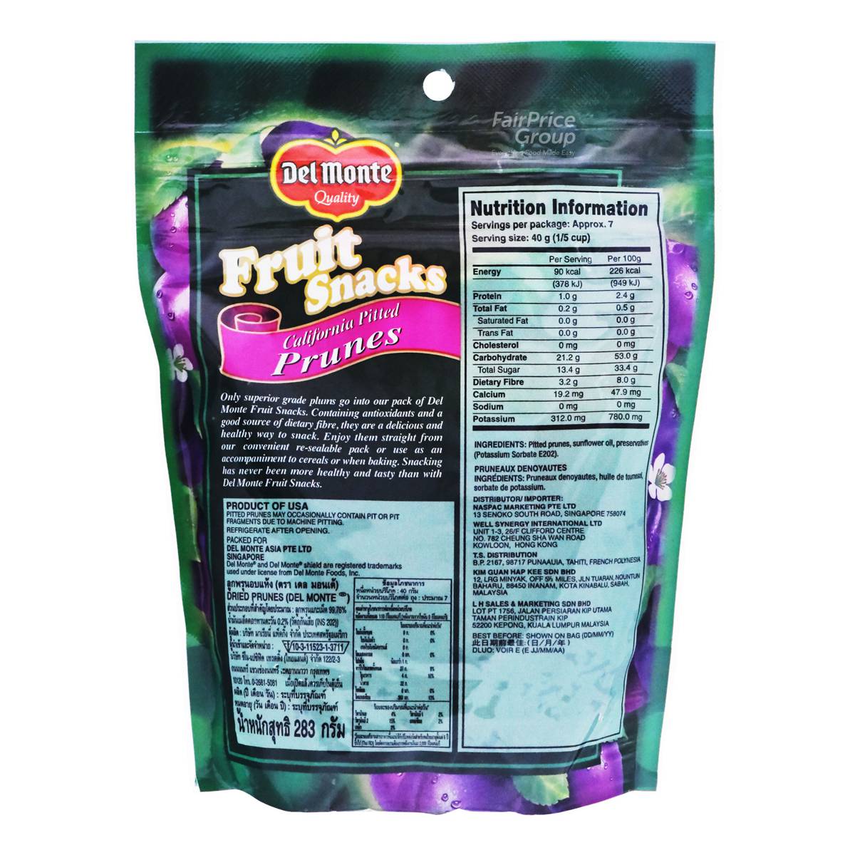 | KEY INFORMATION | Del Monte Premium Pitted Prunes are packed only from premium grade Prunes – a delicious and healthy snack that contains Antioxidants and a good source of dietary fibre. Snacking has never been more healthy and tasty than with Del Monte Premium Pitted Prunes. It has a convenient re-sealable packaging, so you can enjoy your prunes anytime, anywhere. |