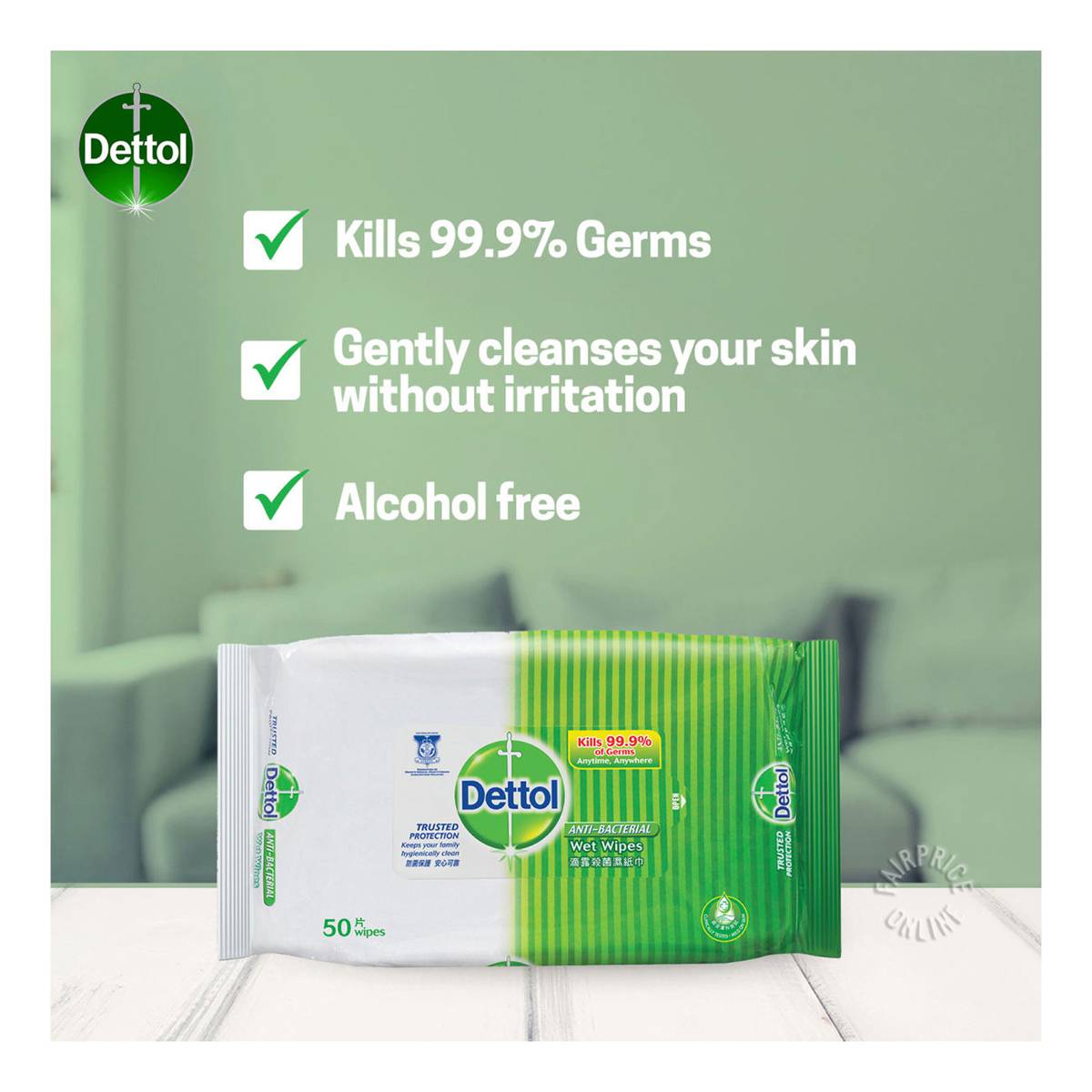 | – | Dettol Anti-bacterial Wet Wipes remove 99.9% of germs anytime, anywhere, from wiping your hands on the go, before and after eating, outdoor activities, before and after using the toilet to offices and schools and in the car while travelling. The soft, textured fabric gently cleanses your skin without irritation. |