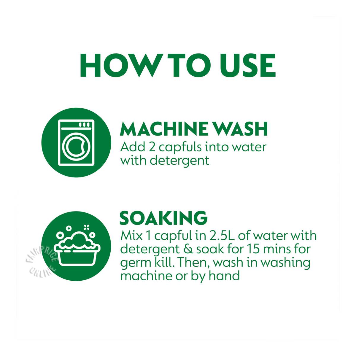 | – | 1. Mix 1 capful of Dettol Laundry Sanitiser in 2.5L water with detergent and soak for 15minutes to kill germs |