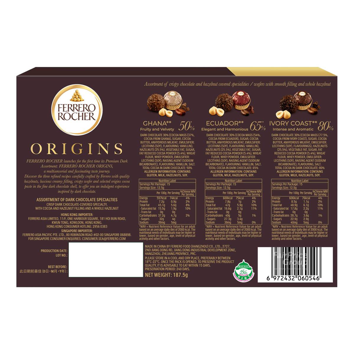 | KEY INFORMATION | Discover the new elegant assorted box filled with the new Ferrero Rocher Origins specialties. This set of 15 pralines is perfect to make special your sharing moments or to offer a precious gift. What makes the new assortment so unique are the three new Ferrero Rocher specialties, characterized by their own aroma and intensity for a new dark chocolate experience. |