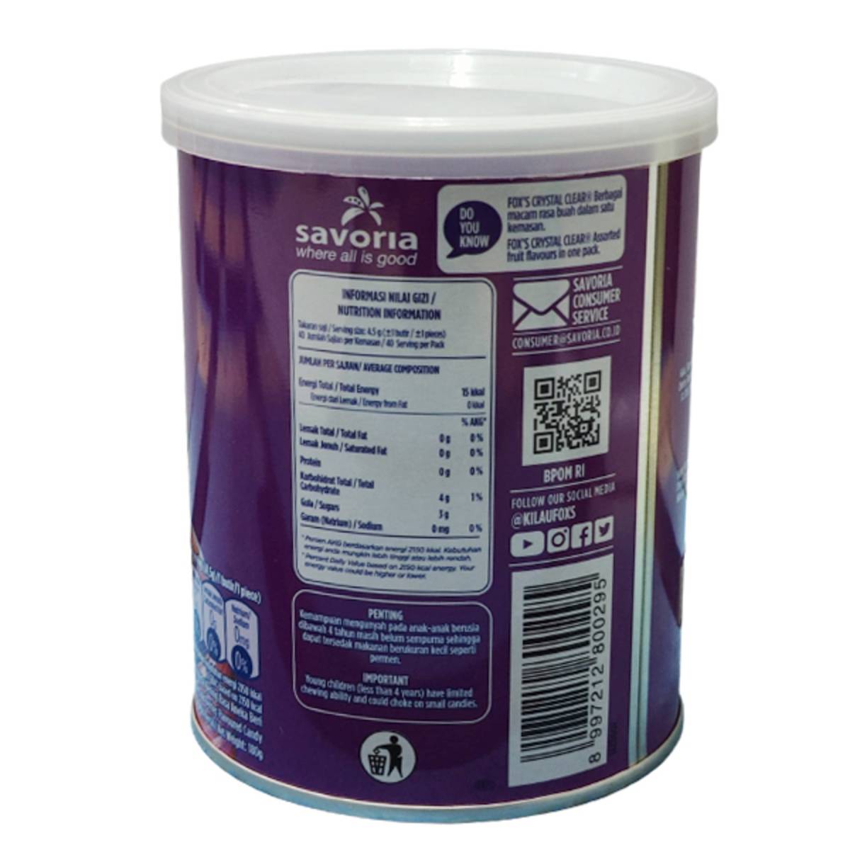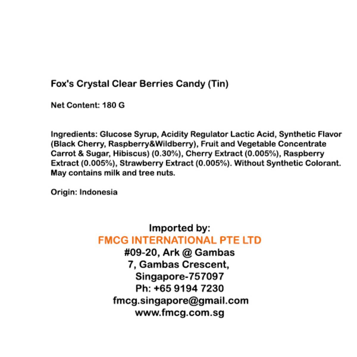 | KEY INFORMATION | Fox’s Crystal Clear Berries flavoured Candy is a delightful choice of candy for not only kids, but adults as well. Offering the real flavor of Wildberry, Raspberry & Black Cherry give them a sweet and delectable taste that will suit any pallet. A refreshing combination of mint and fruit flavors with natural colorings makes Fox’s Fruity Mints a highly anticipated addition to Fox’s flavors. |