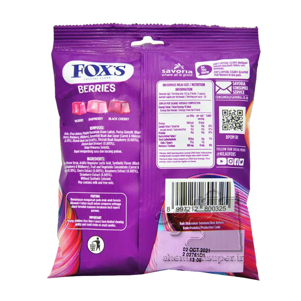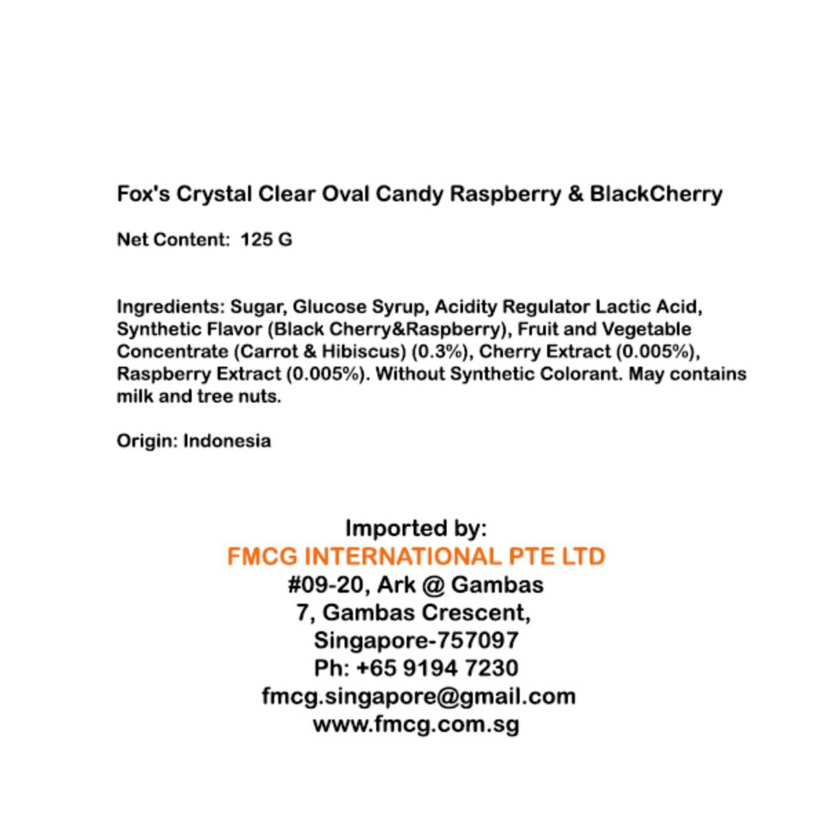 | KEY INFORMATION | Fox’s Crystal Clear Berries Oval Candy Raspberry & Black Cherry. One of the most popular brands dealing with Chocolates & Sweets and Branded Foods comes with a unique shape,in Raspberry and Black Cherry flavour. These crystal clear candies are made with glucose syrup to give it a sweet flavour. Crystal clear candies with a unique shape, that come in mint as well as fruit flavours. |