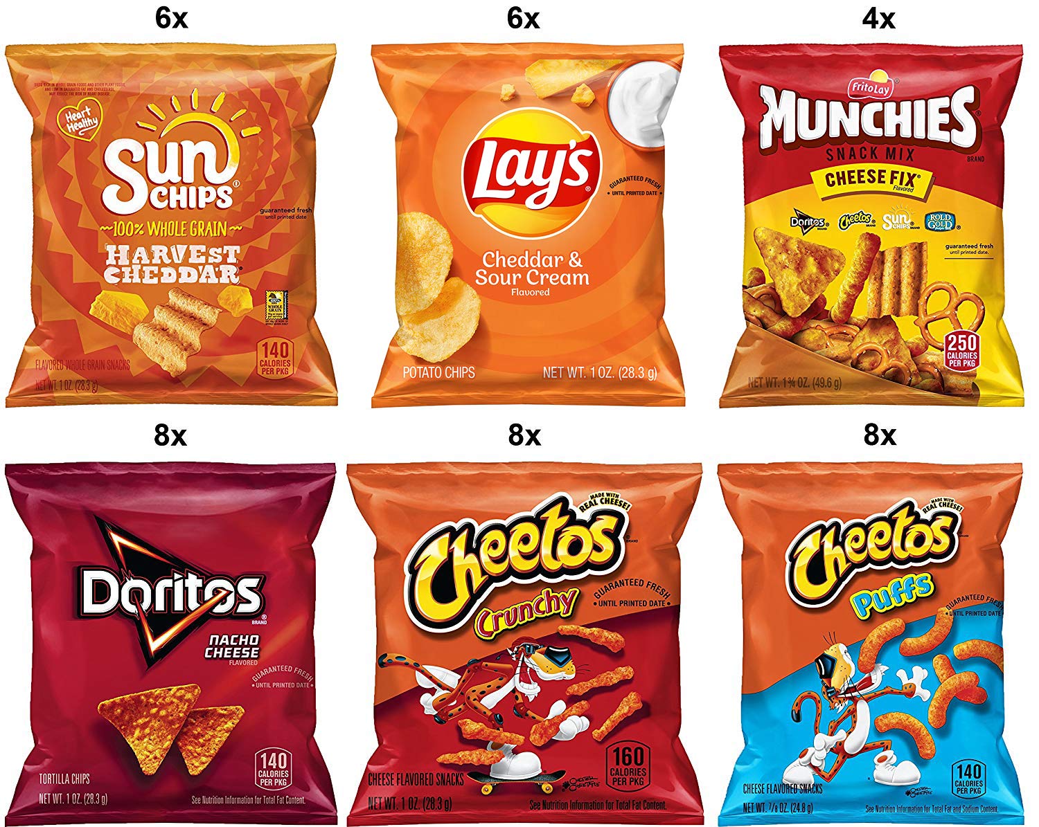 - 40 Single Serve favorites Lay’s Classic Potato Chips. Crunchy Cheetos. Chili Cheese Fritos. Lay’s BBQ Potato Chips. Original Funyuns. Doritos Nacho Cheese. Original Fritos. and Ruffles Cheddar & Sour Cream Chips