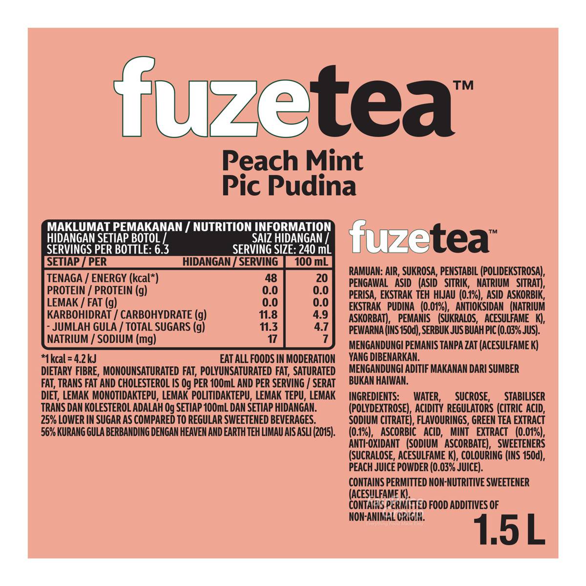 | KEY INFORMATION | Fuze Tea Peach Mint Tea fuses sweet black tea with the aromatic peach and the refreshing and cooling mint. |