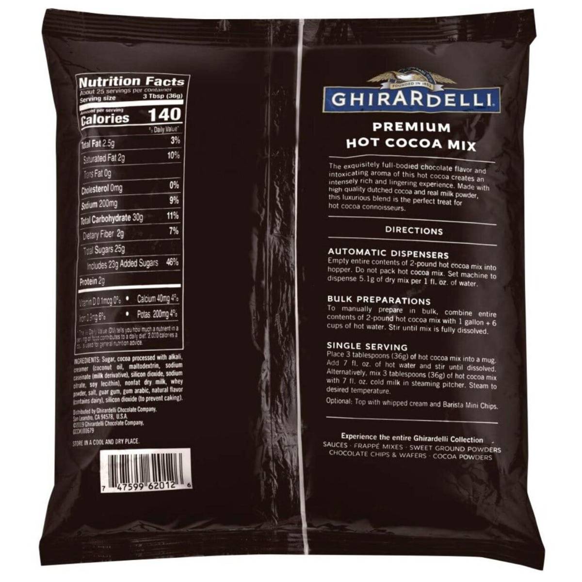 | KEY INFORMATION | Ghirardellis premium hot cocoa is made from high quality cocoa beans for a classic rich, intense chocolate flavor. Ideal as an indulgent hot cocoa or added to coffee for a decadent mocha |