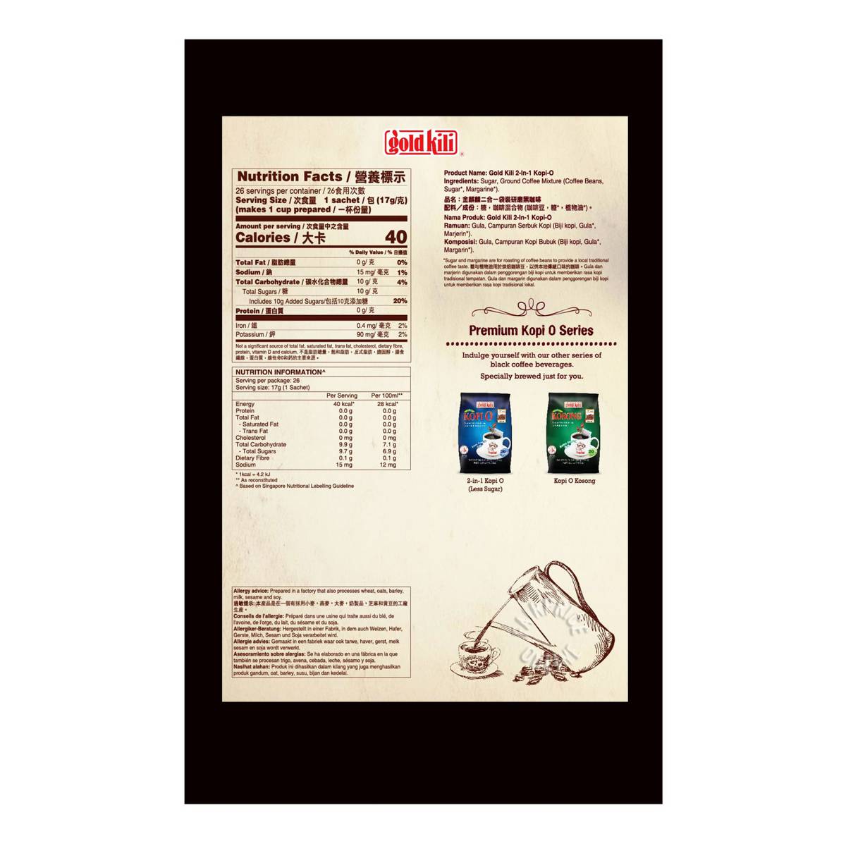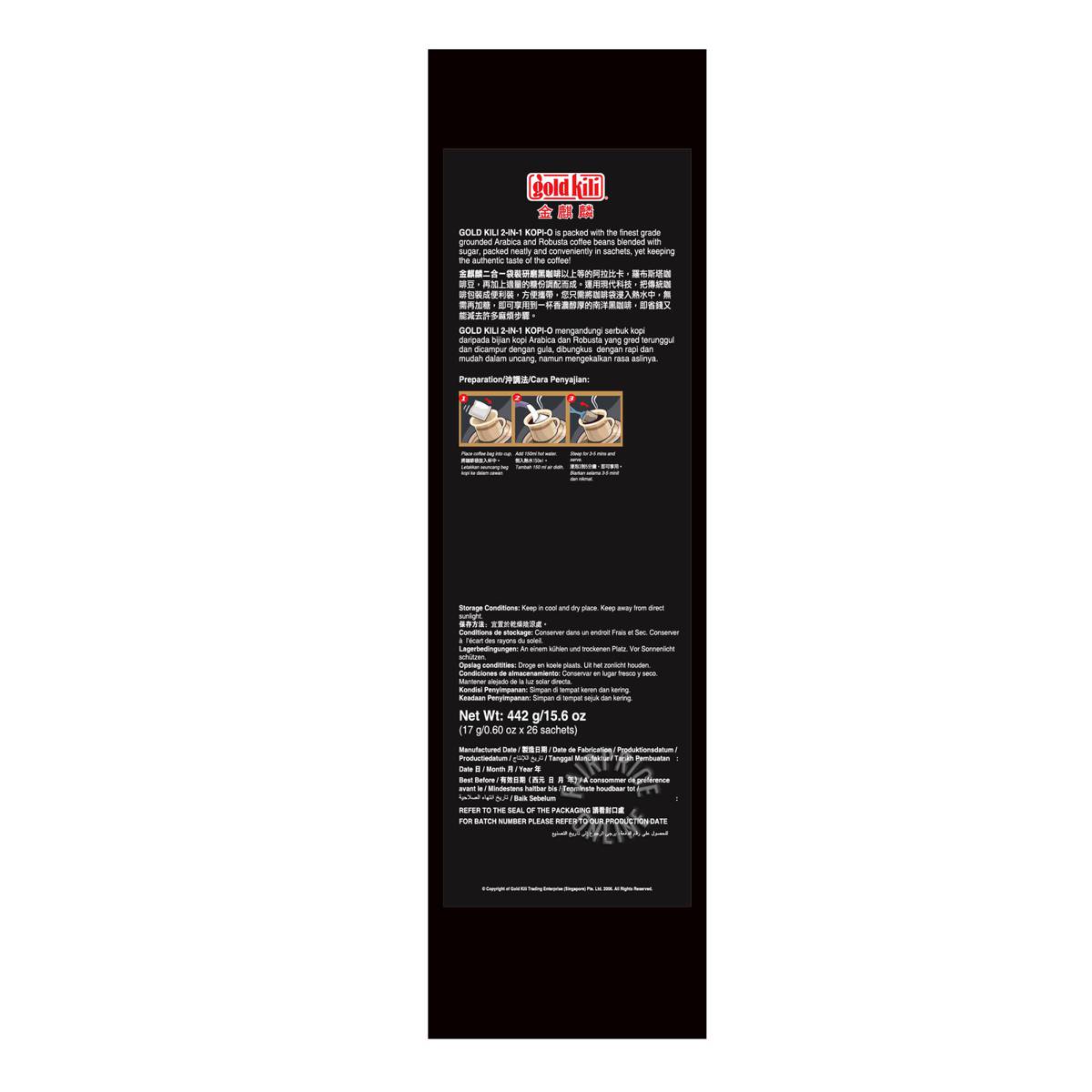 | KEY INFORMATION | With Goldkili 2 in 1 Kopi-O, save all the time and hassle preparing a cup of strong black coffee, an ideal drink for daily consumption. Premium rich aroma packed with the finest grade ground coffee plus sugar – all in neat, convenient sachets. It has no preservative or artificial colouring. |