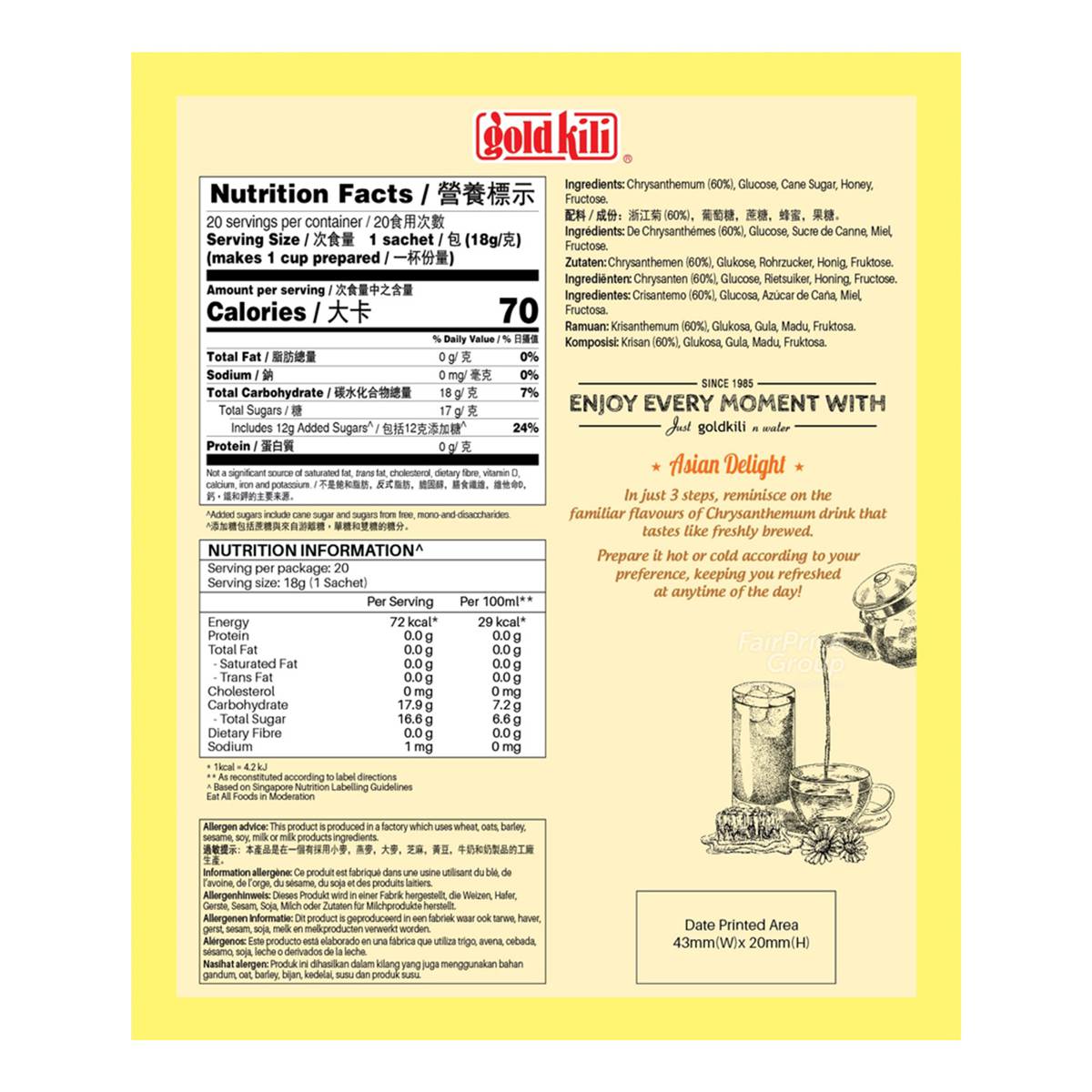 | KEY INFORMATION | Made from high grade chrysanthemum and pure honey without preservative or artificial colouring, giving a refreshing feeling when consumed. |