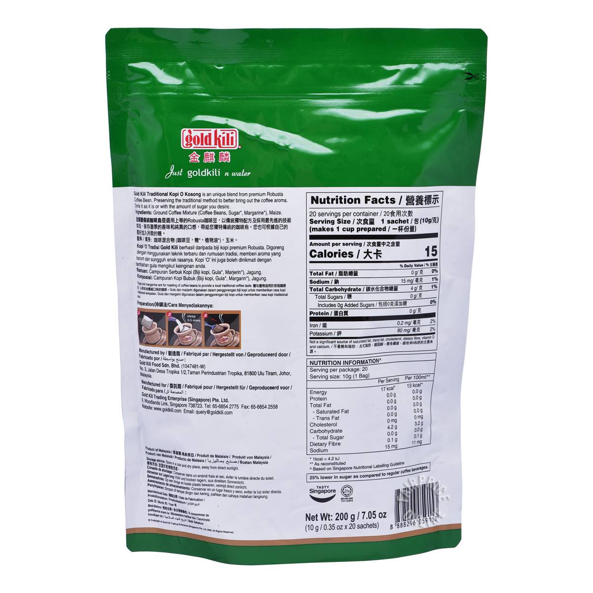 | KEY INFORMATION | Gold Kili Traditional Kopi O Kosong is an unique blend from premium robusta coffee bean. Preserving the traditional method to better bring out the coffee aroma. Drink it as it is or with the amount of sugar desire. |