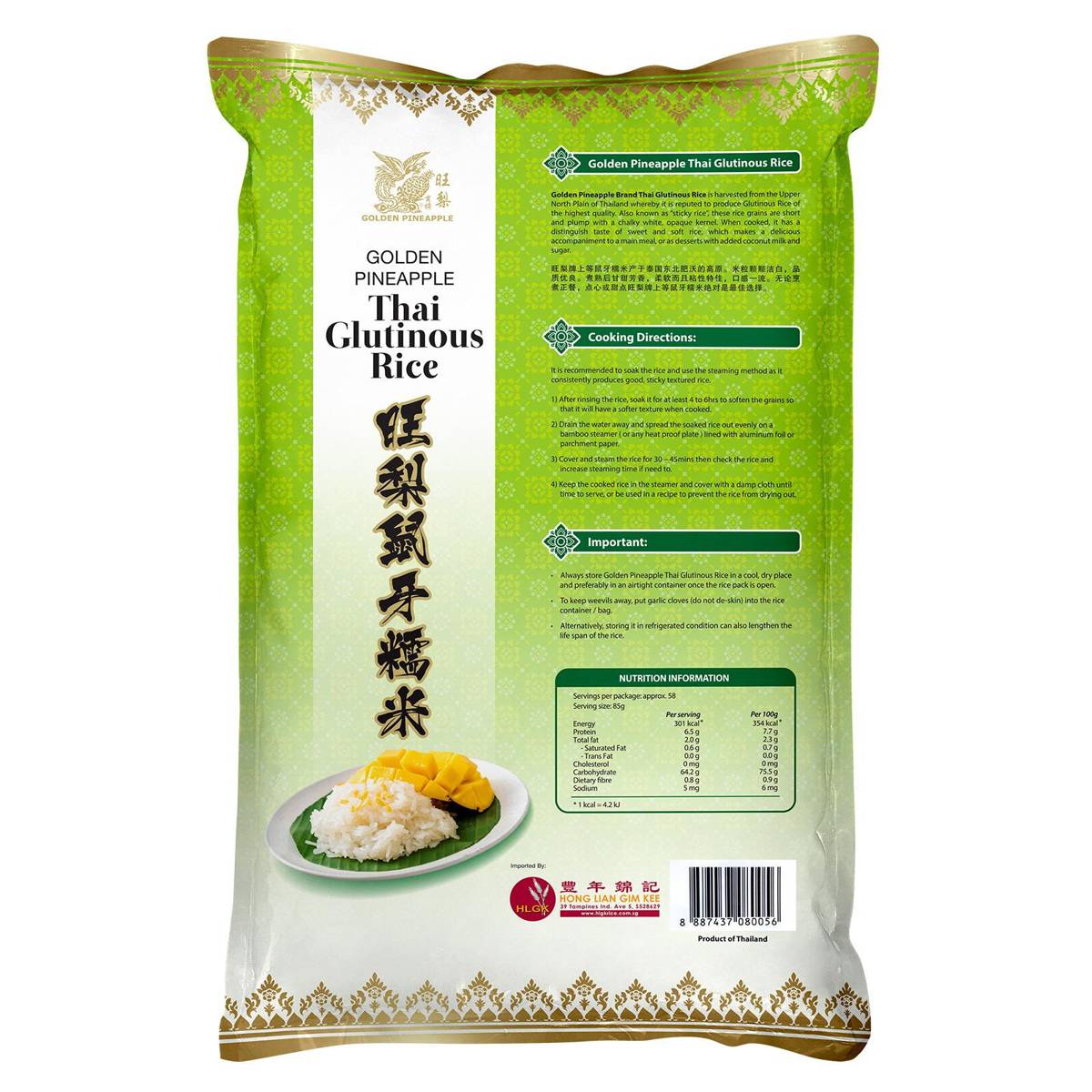 | KEY INFORMATION | Premium glutinous rice harvested from the upper north plain of Thailand, known for its good quality. Delicious as a main meal or commonly used for desserts with added coconut milk and sugar. |