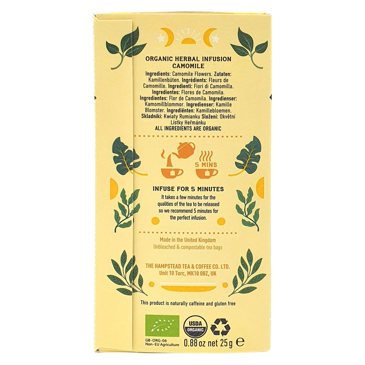 | KEY INFORMATION | Our carefully gathered beautiful golden Camomile flowers are gently tumbled together to help you find that peaceful moment again. Camomile relieves inflammation, soothes and relaxes. Naturally caffeine-free. |