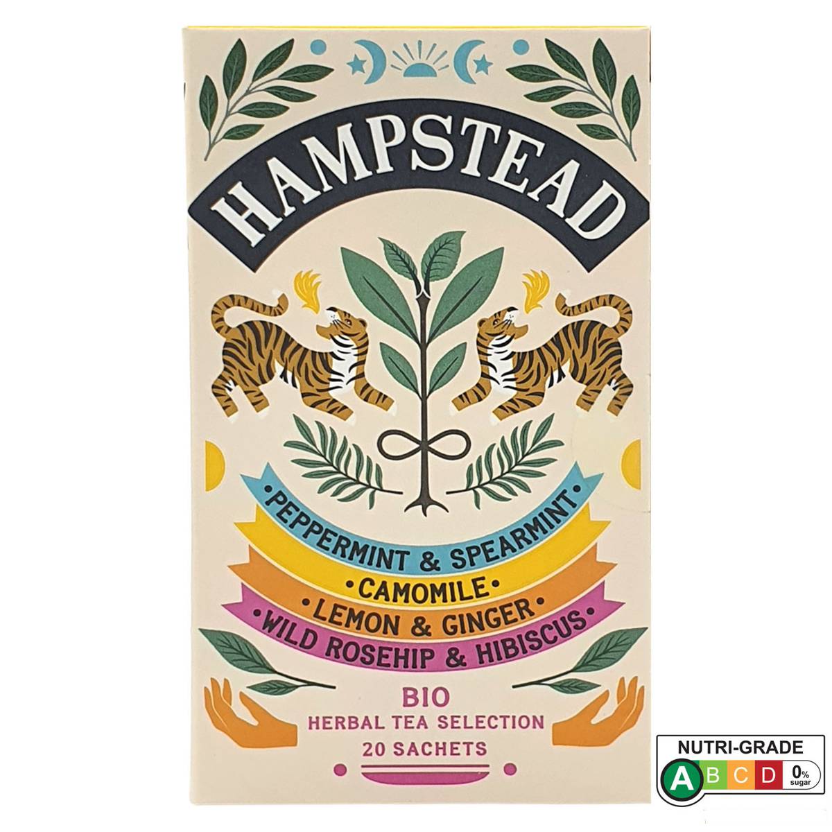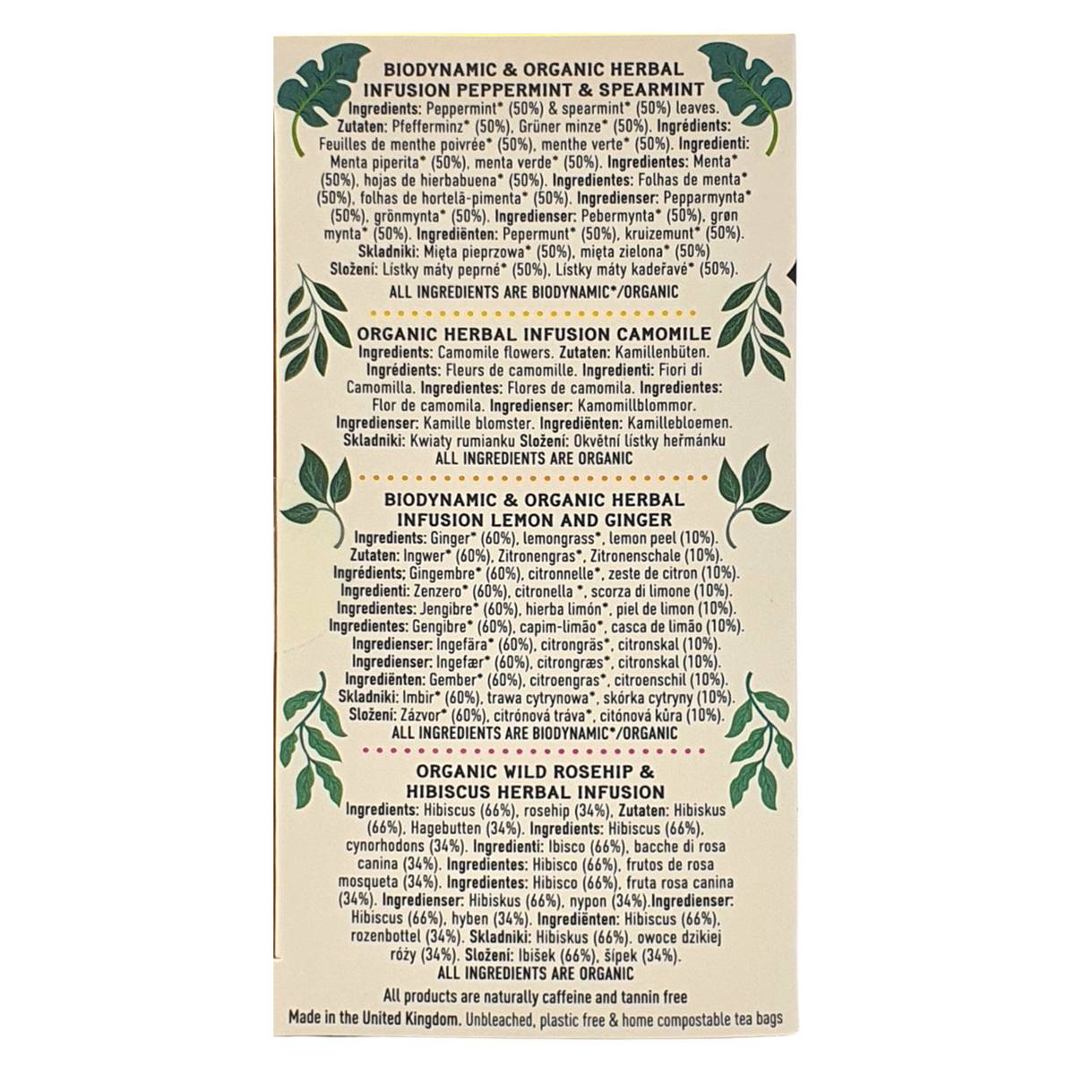 | KEY INFORMATION | Organic Biodynamic and Fairtrade Peppermint & Spearmint, Organic Camomile, Organic Biodynamic Lemon & Ginger and Organic Fairtrade Rosehip & Hibiscus. |