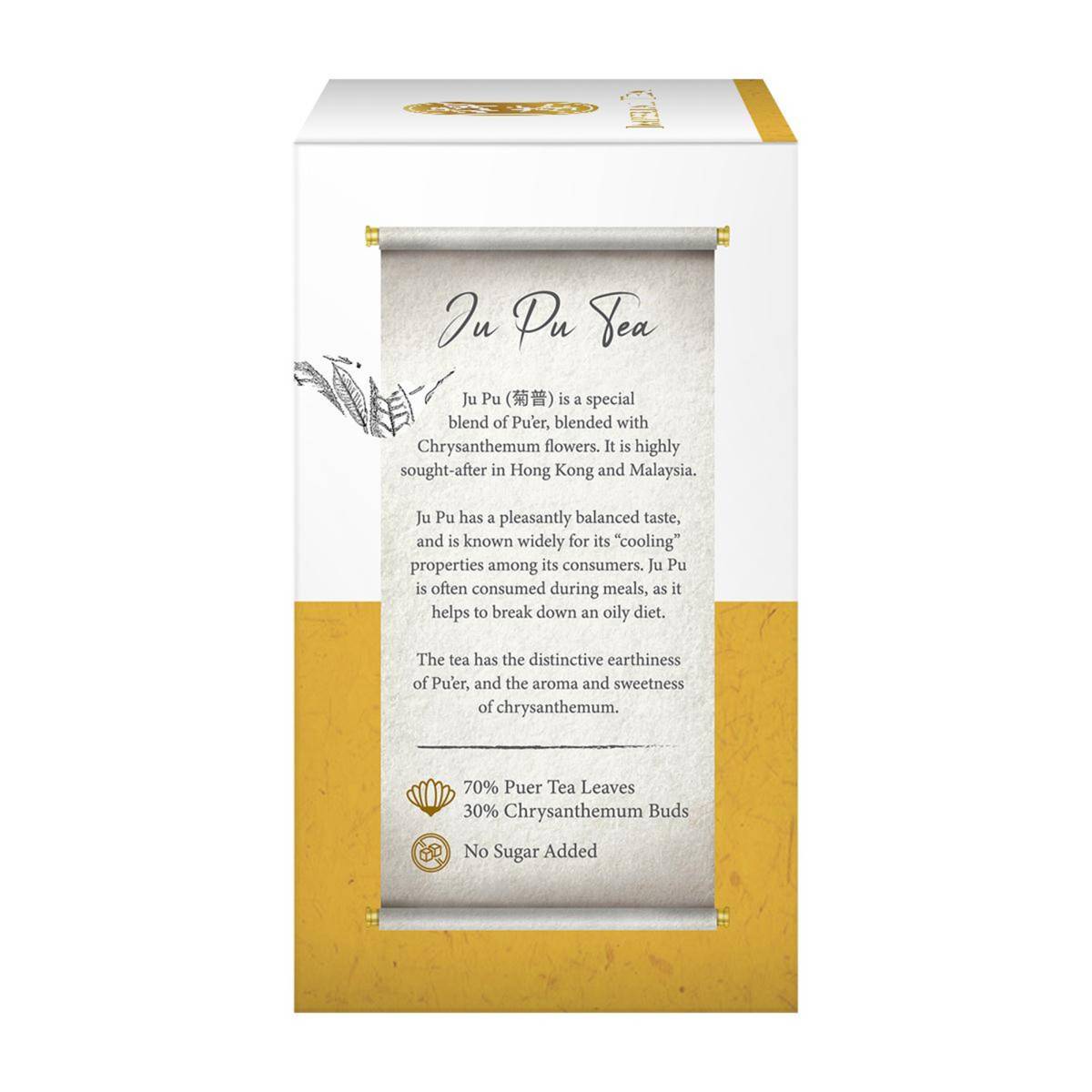 | KEY INFORMATION | 70% Puer Tea Leaves combined with 30% Chrysanthemum Buds Distinctive earthiness of Puer, and the aroma and sweetness of chrysanthemum No sugar added |