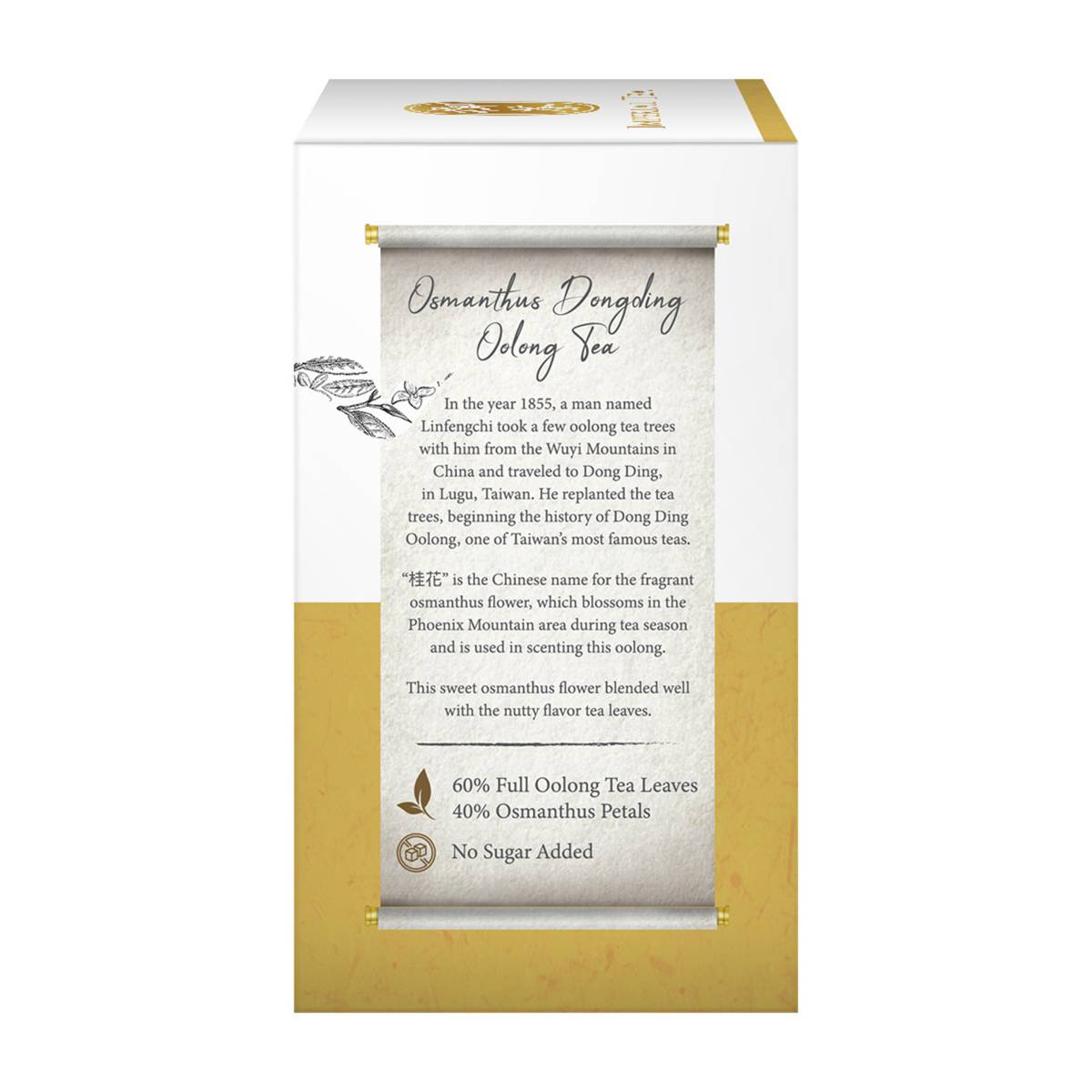 | KEY INFORMATION | 60% Oolong Tea Leaves combined with 40% Osmanthus Petals Sweet osmanthus flower and nutty flavour No sugar added |