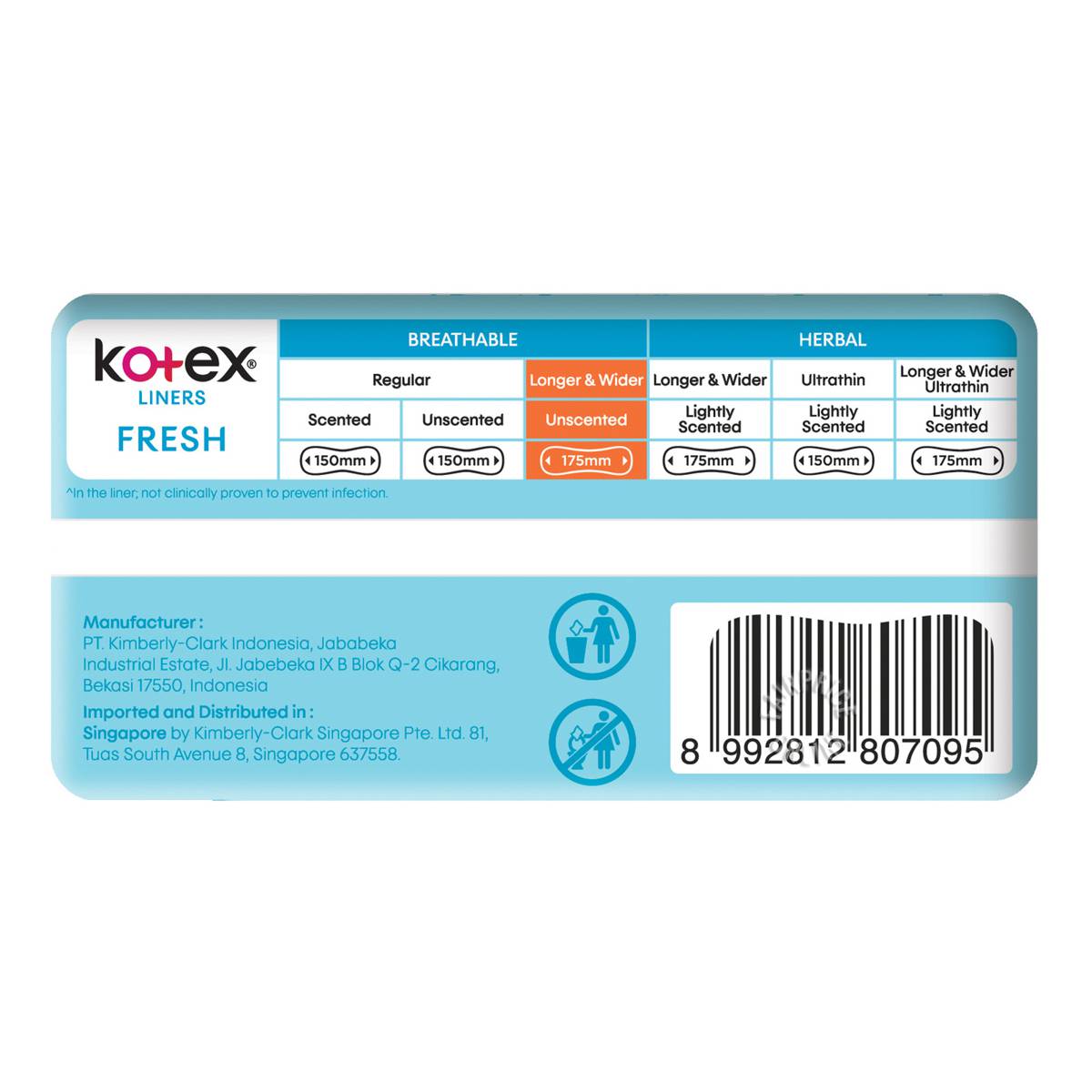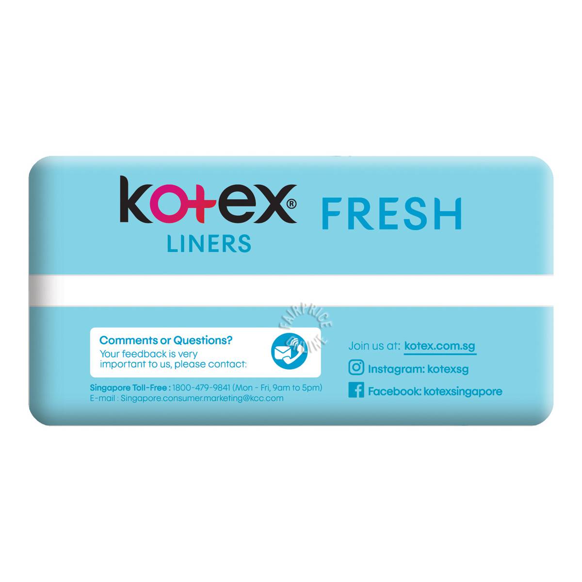 | – | Kotex Fresh Breathable Liners® help skin breath naturally and absorb unwanted wetness so you would feel confident and fresh all day as it suitable for daily use. It is designed with: |