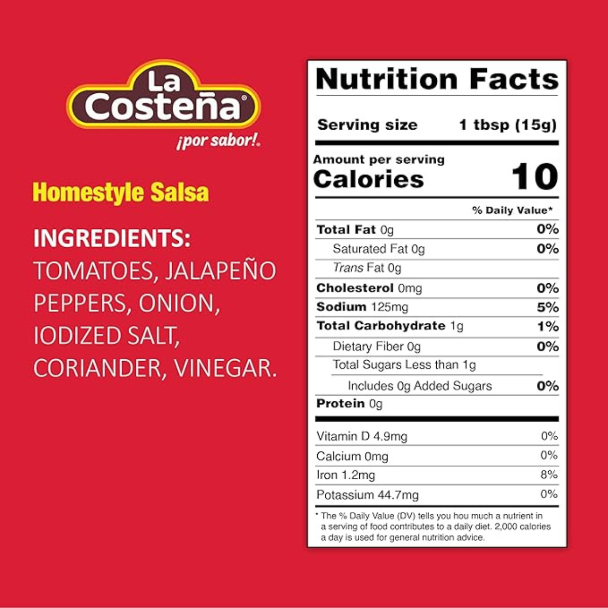 | PREPARATION | Homestyle Mexican Salsa by La Costena is a medium spicy, chunky red sauce made with natural red tomatoes, chile, onions, garlic and cilantro to give it that unique Red jalapeno taste the salsa has. |