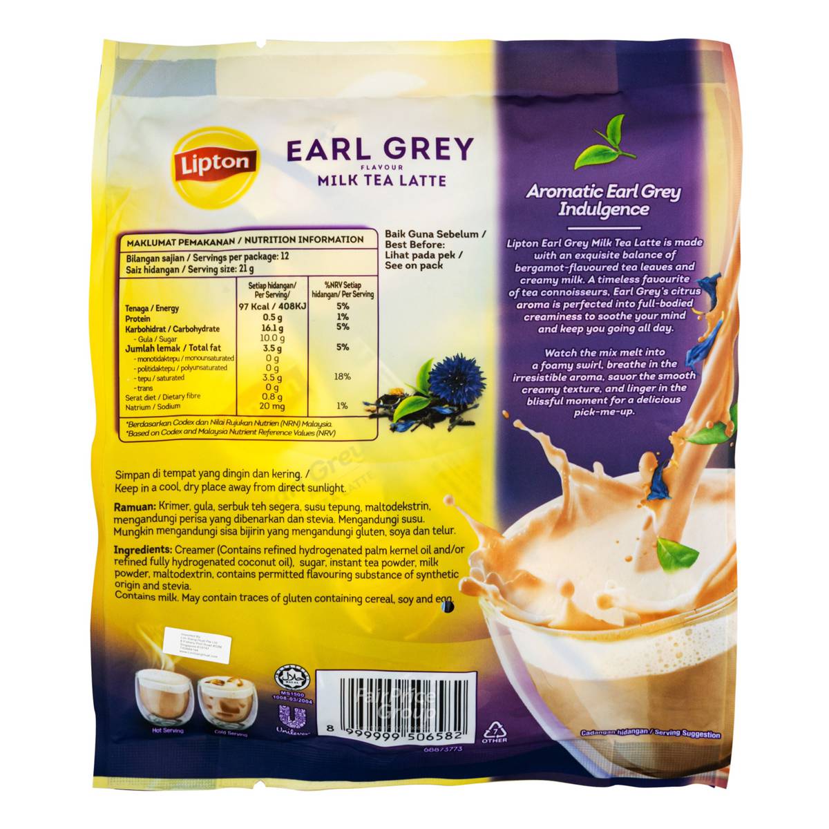 | KEY INFORMATION | Lipton Earl Grey Milk Tea Latte is made of an exquisite balance of bergamot-flavoured tea leaves and creamy milk. A timeless favourite of tea connoisseurs, Earl Grey’s citrus aroma is perfected into full-bodied creaminess to soothe your mind and keep you going all day. |