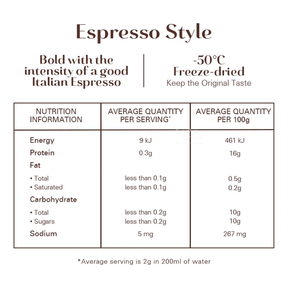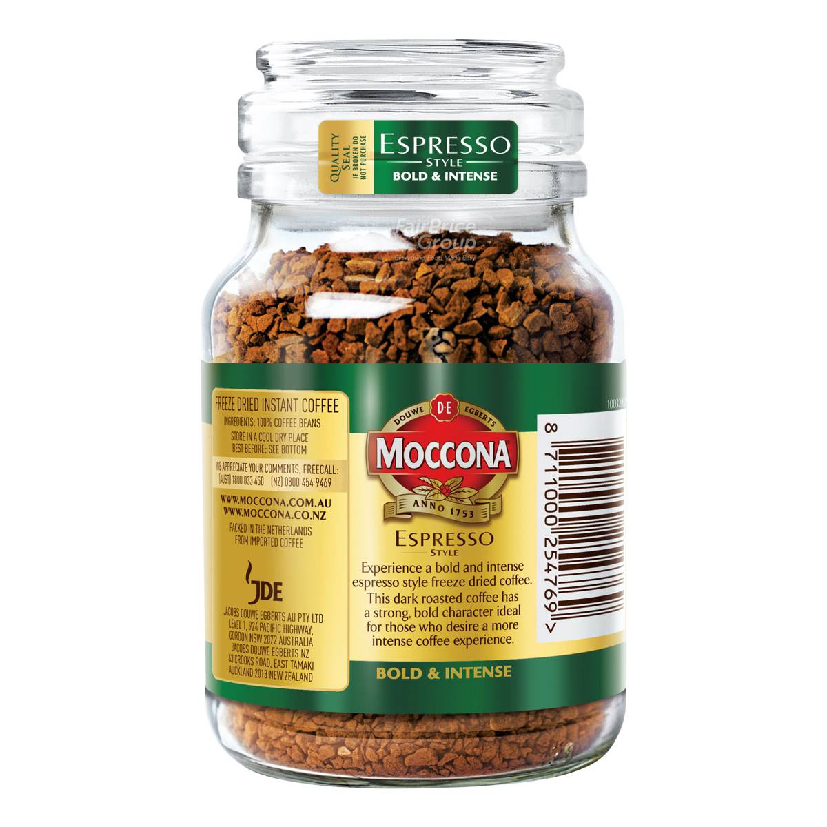 | KEY INFORMATION | For the moments where strength is needed, Moccona Espresso Style is perfect cup. A big bold flavour with the intensity of a good Italian espresso, it’s nicely rounded and serves up that cafe experience in an instant with no artificial colourings nor flavouring. |