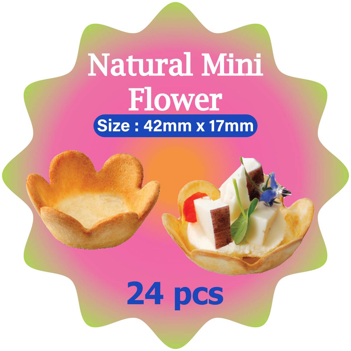 | KEY INFORMATION | These Natural Mini Flower Pastry Tarts come in a set of 24, with each tart measuring 42mmx17mm. Made from all natural ingredients, they offer a delicious and visually appealing twist on traditional pastry. Perfect for entertaining guests or as an indulgent treat for yourself. |